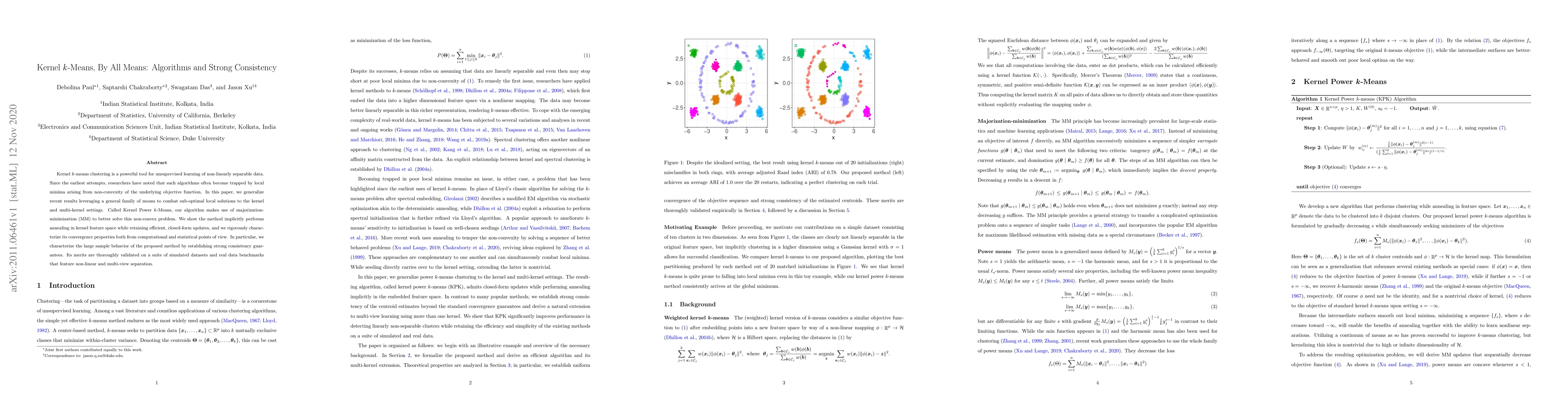 This paper proposes Kernel Power $k$-Means, a novel algorithm using majorization-minimization to address local minima in kernel $k$-means clustering. It demonstrates strong consistency and efficient, closed-form updates, validated through simulations and real-world datasets.