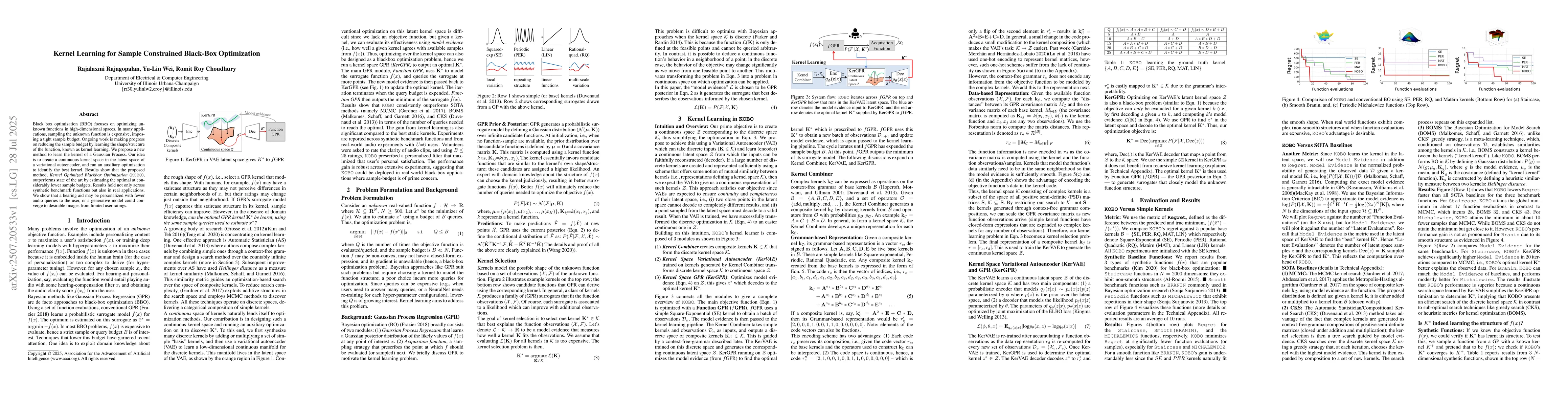 Black box optimization (BBO) focuses on optimizing unknown functions in high-dimensional spaces. In many applications, sampling the unknown function is expensive, imposing a tight sample budget. Ongoing work is making progress on reducing the sample budget by learning the shape/structure of the function, known as kernel learning. We propose a new method to learn the kernel of a Gaussian Process. Our idea is to create a continuous kernel space in the latent space of a variational autoencoder, and run an auxiliary optimization to identify the best kernel. Results show that the proposed method, Kernel Optimized Blackbox Optimization (KOBO), outperforms state of the art by estimating the optimal at considerably lower sample budgets. Results hold not only across synthetic benchmark functions but also in real applications. We show that a hearing aid may be personalized with fewer audio queries to the user, or a generative model could converge to desirable images from limited user ratings.
