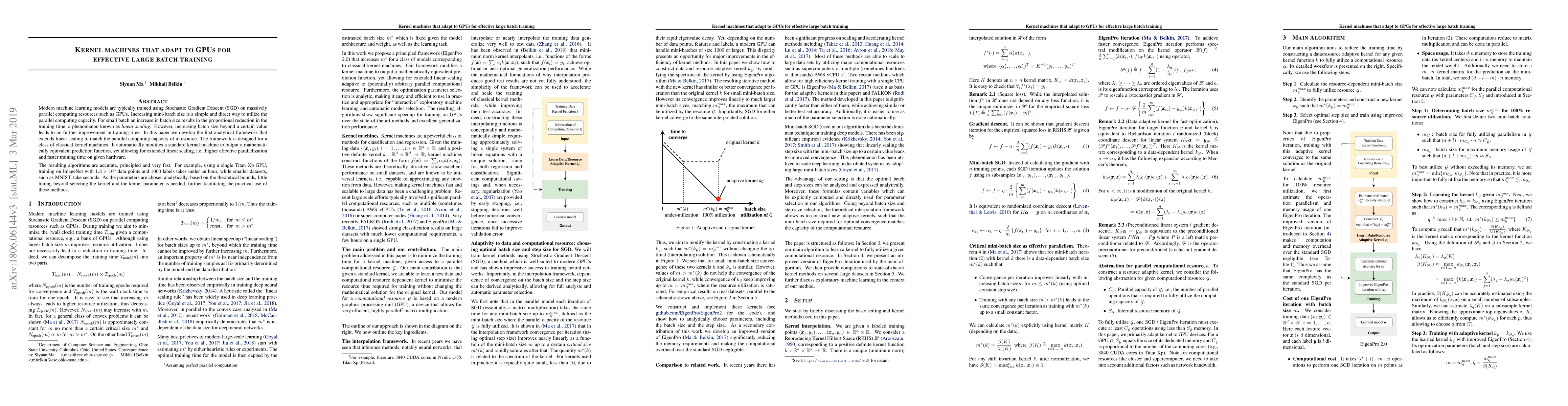 Modern machine learning models are typically trained using Stochastic Gradient Descent (SGD) on massively parallel computing resources such as GPUs. Increasing mini-batch size is a simple and direct way to utilize the parallel computing capacity. For small batch an increase in batch size results in the proportional reduction in the training time, a phenomenon known as linear scaling. However, increasing batch size beyond a certain value leads to no further improvement in training time. In this paper we develop the first analytical framework that extends linear scaling to match the parallel computing capacity of a resource. The framework is designed for a class of classical kernel machines. It automatically modifies a standard kernel machine to output a mathematically equivalent prediction function, yet allowing for extended linear scaling, i.e., higher effective parallelization and faster training time on given hardware. The resulting algorithms are accurate, principled and very fast. For example, using a single Titan Xp GPU, training on ImageNet with $1.3\times 10^6$ data points and $1000$ labels takes under an hour, while smaller datasets, such as MNIST, take seconds. As the parameters are chosen analytically, based on the theoretical bounds, little tuning beyond selecting the kernel and the kernel parameter is needed, further facilitating the practical use of these methods.