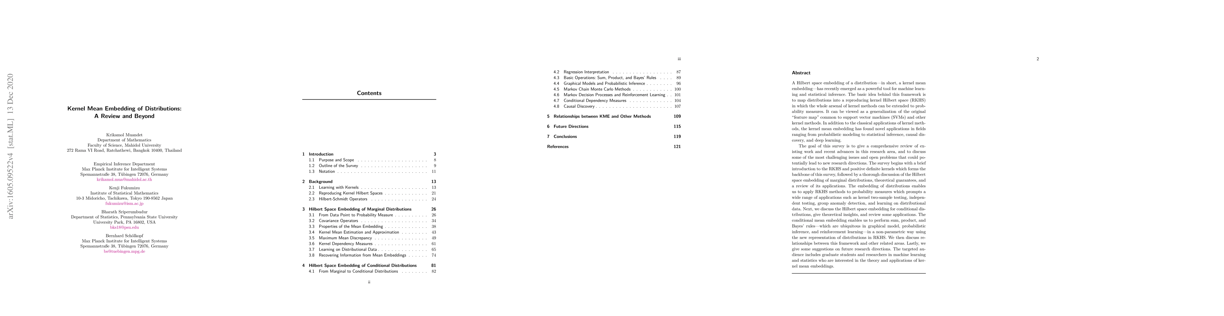 A Hilbert space embedding of a distribution---in short, a kernel mean embedding---has recently emerged as a powerful tool for machine learning and inference. The basic idea behind this framework is to map distributions into a reproducing kernel Hilbert space (RKHS) in which the whole arsenal of kernel methods can be extended to probability measures. It can be viewed as a generalization of the original "feature map" common to support vector machines (SVMs) and other kernel methods. While initially closely associated with the latter, it has meanwhile found application in fields ranging from kernel machines and probabilistic modeling to statistical inference, causal discovery, and deep learning. The goal of this survey is to give a comprehensive review of existing work and recent advances in this research area, and to discuss the most challenging issues and open problems that could lead to new research directions. The survey begins with a brief introduction to the RKHS and positive definite kernels which forms the backbone of this survey, followed by a thorough discussion of the Hilbert space embedding of marginal distributions, theoretical guarantees, and a review of its applications. The embedding of distributions enables us to apply RKHS methods to probability measures which prompts a wide range of applications such as kernel two-sample testing, independent testing, and learning on distributional data. Next, we discuss the Hilbert space embedding for conditional distributions, give theoretical insights, and review some applications. The conditional mean embedding enables us to perform sum, product, and Bayes' rules---which are ubiquitous in graphical model, probabilistic inference, and reinforcement learning---in a non-parametric way. We then discuss relationships between this framework and other related areas. Lastly, we give some suggestions on future research directions.