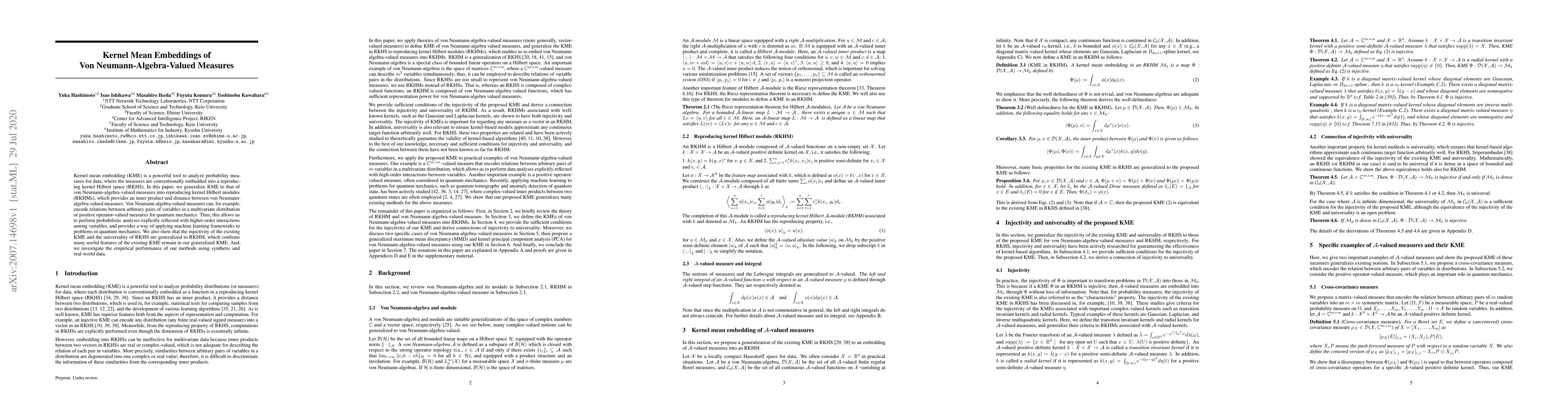 The paper generalizes Kernel Mean Embeddings (KME) to von Neumann-algebra-valued measures using reproducing kernel Hilbert modules (RKHMs), enabling the analysis of higher-order interactions among variables and application to quantum mechanics problems.