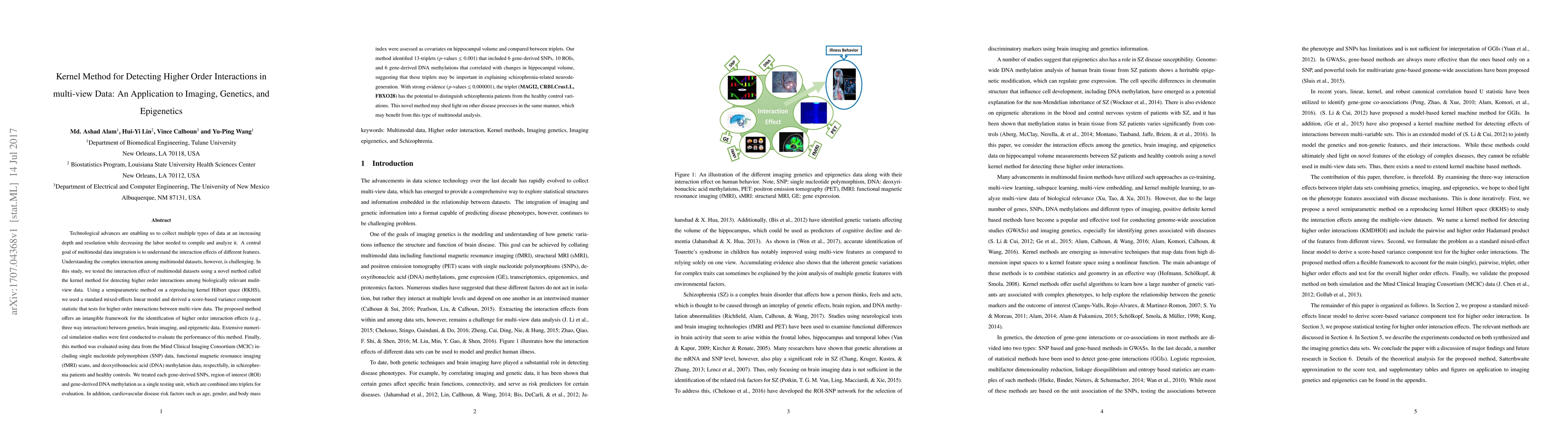 In this study, we tested the interaction effect of multimodal datasets using a novel method called the kernel method for detecting higher order interactions among biologically relevant mulit-view data. Using a semiparametric method on a reproducing kernel Hilbert space (RKHS), we used a standard mixed-effects linear model and derived a score-based variance component statistic that tests for higher order interactions between multi-view data. The proposed method offers an intangible framework for the identification of higher order interaction effects (e.g., three way interaction) between genetics, brain imaging, and epigenetic data. Extensive numerical simulation studies were first conducted to evaluate the performance of this method. Finally, this method was evaluated using data from the Mind Clinical Imaging Consortium (MCIC) including single nucleotide polymorphism (SNP) data, functional magnetic resonance imaging (fMRI) scans, and deoxyribonucleic acid (DNA) methylation data, respectfully, in schizophrenia patients and healthy controls. We treated each gene-derived SNPs, region of interest (ROI) and gene-derived DNA methylation as a single testing unit, which are combined into triplets for evaluation. In addition, cardiovascular disease risk factors such as age, gender, and body mass index were assessed as covariates on hippocampal volume and compared between triplets. Our method identified $13$-triplets ($p$-values $\leq 0.001$) that included $6$ gene-derived SNPs, $10$ ROIs, and $6$ gene-derived DNA methylations that correlated with changes in hippocampal volume, suggesting that these triplets may be important in explaining schizophrenia-related neurodegeneration. With strong evidence ($p$-values $\leq 0.000001$), the triplet ({\bf MAGI2, CRBLCrus1.L, FBXO28}) has the potential to distinguish schizophrenia patients from the healthy control variations.