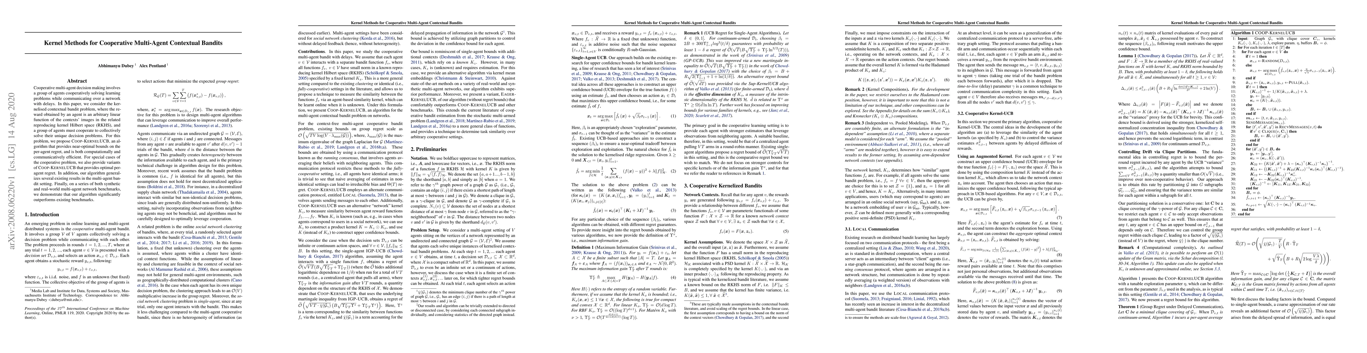 This paper proposes \textsc{Coop-KernelUCB}, an algorithm for cooperative multi-agent contextual bandits that achieves near-optimal per-agent regret bounds, while being computationally and communicatively efficient. The algorithm outperforms existing benchmarks on both synthetic and real-world datasets.