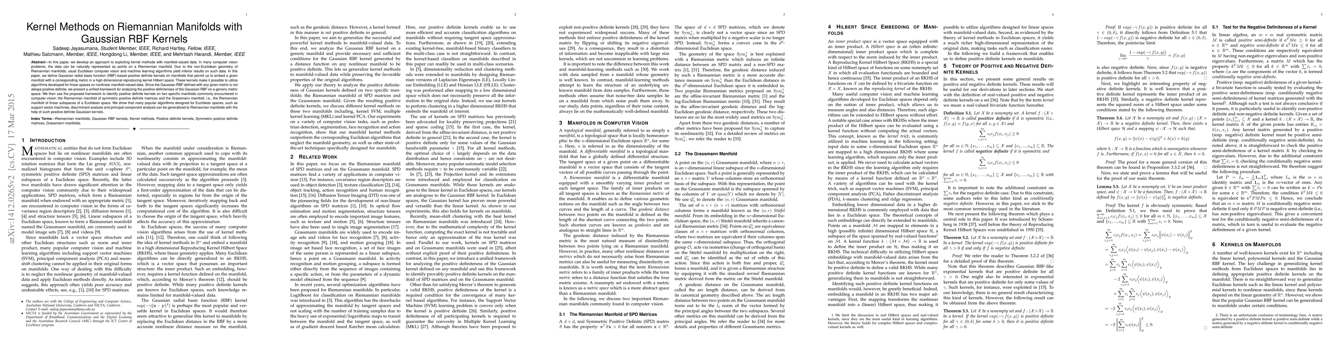 This paper develops Gaussian radial basis function (RBF) kernels on Riemannian manifolds to enable the use of linear algorithms on nonlinear manifold-valued data. It presents a framework for ensuring the positive definiteness of Gaussian RBF kernels on generic metric spaces and applies this to two specific manifolds, enabling the generalization of popular Euclidean algorithms to Riemannian manifolds.