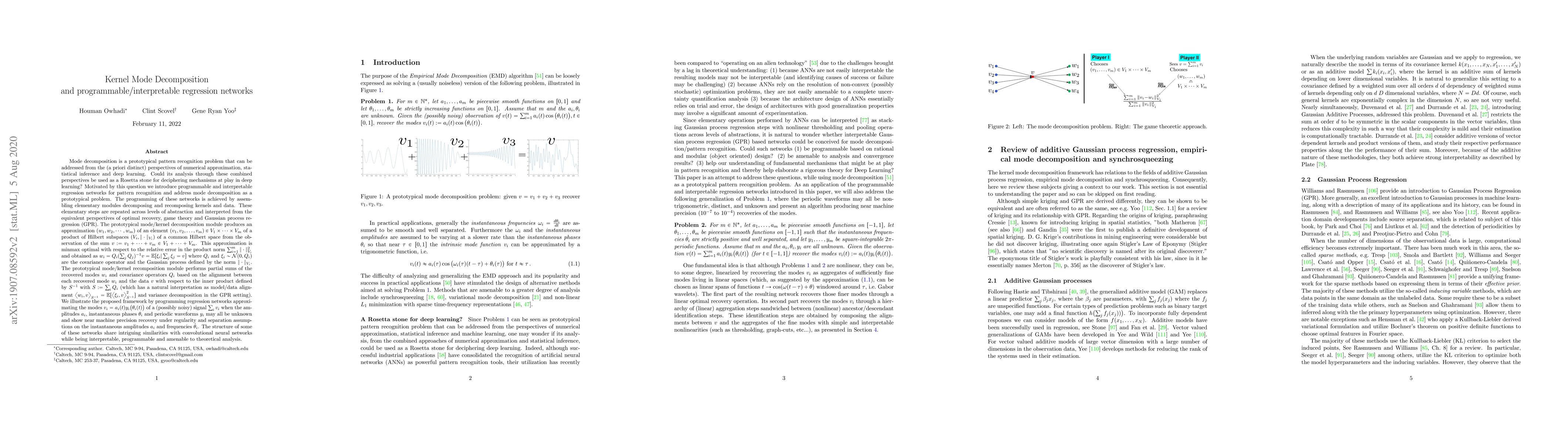 Mode decomposition is a prototypical pattern recognition problem that can be addressed from the (a priori distinct) perspectives of numerical approximation, statistical inference and deep learning. Could its analysis through these combined perspectives be used as a Rosetta stone for deciphering mechanisms at play in deep learning? Motivated by this question we introduce programmable and interpretable regression networks for pattern recognition and address mode decomposition as a prototypical problem. The programming of these networks is achieved by assembling elementary modules decomposing and recomposing kernels and data. These elementary steps are repeated across levels of abstraction and interpreted from the equivalent perspectives of optimal recovery, game theory and Gaussian process regression (GPR). The prototypical mode/kernel decomposition module produces an optimal approximation $(w_1,w_2,\cdots,w_m)$ of an element $(v_1,v_2,\ldots,v_m)$ of a product of Hilbert subspaces of a common Hilbert space from the observation of the sum $v:=v_1+\cdots+v_m$. The prototypical mode/kernel recomposition module performs partial sums of the recovered modes $w_i$ based on the alignment between each recovered mode $w_i$ and the data $v$. We illustrate the proposed framework by programming regression networks approximating the modes $v_i= a_i(t)y_i\big(\theta_i(t)\big)$ of a (possibly noisy) signal $\sum_i v_i$ when the amplitudes $a_i$, instantaneous phases $\theta_i$ and periodic waveforms $y_i$ may all be unknown and show near machine precision recovery under regularity and separation assumptions on the instantaneous amplitudes $a_i$ and frequencies $\dot{\theta}_i$. The structure of some of these networks share intriguing similarities with convolutional neural networks while being interpretable, programmable and amenable to theoretical analysis.