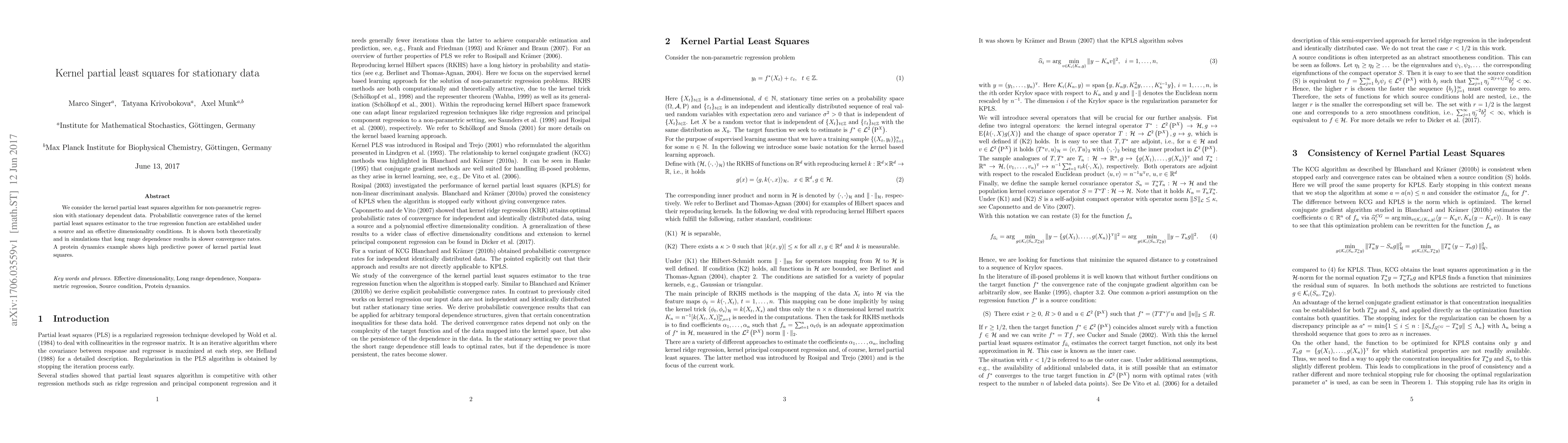 Summary: The paper establishes probabilistic convergence rates for kernel partial least squares in non-parametric regression with stationary data, demonstrating slower convergence due to long-range dependence and showcasing high predictive power in a protein dynamics example.