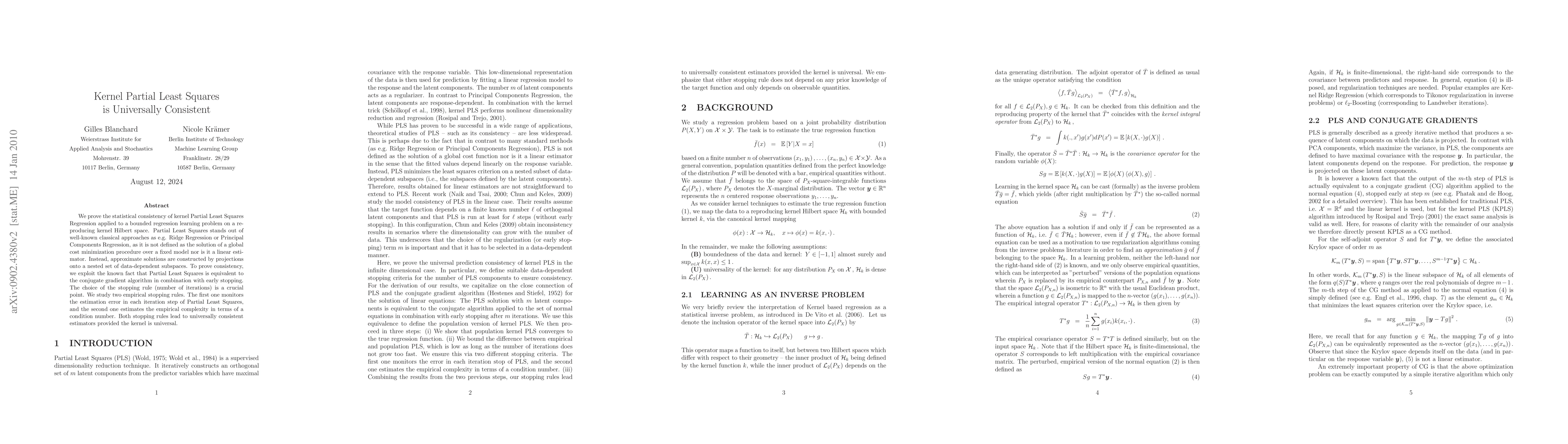 This paper proves the statistical consistency of kernel Partial Least Squares Regression in bounded regression problems, demonstrating that it can provide accurate estimates as the sample size grows. The authors show that consistency holds for two different empirical stopping rules, given that the kernel used is universal.