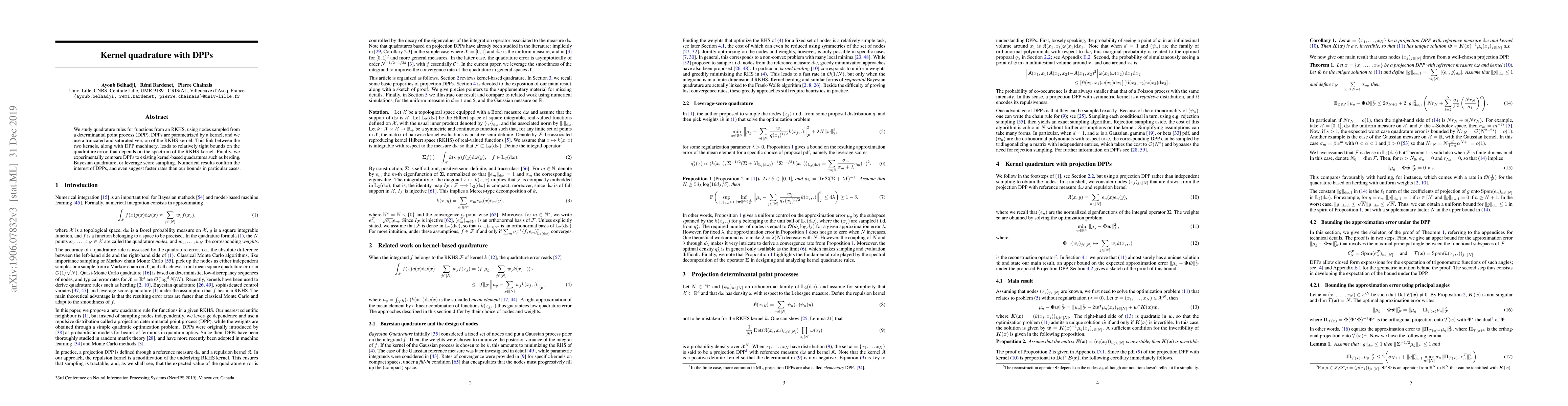 The paper studies quadrature rules for functions in Reproducing Kernel Hilbert Spaces (RKHS) using nodes sampled from Determinantal Point Processes (DPPs). It links the RKHS kernel to the DPP kernel, providing bounds on quadrature error dependent on the RKHS kernel's spectrum.