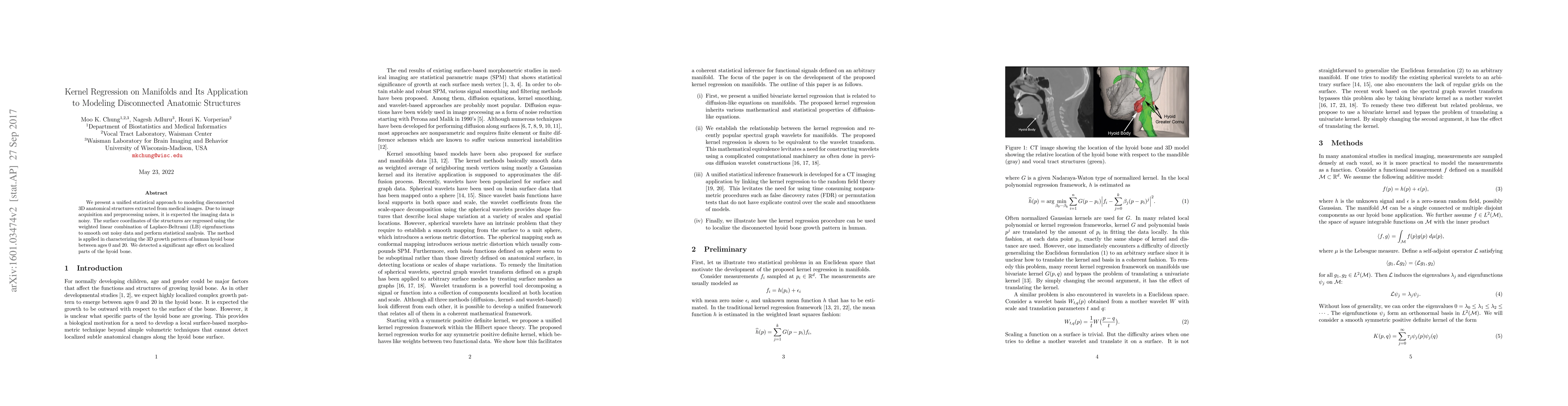 This paper proposes a kernel regression method on manifolds to model noisy, disconnected 3D anatomical structures from medical images, utilizing Laplace-Beltrami eigenfunctions for smooth regression. The approach is demonstrated by analyzing the 3D growth pattern of the human hyoid bone, revealing significant age-related changes in localized regions.