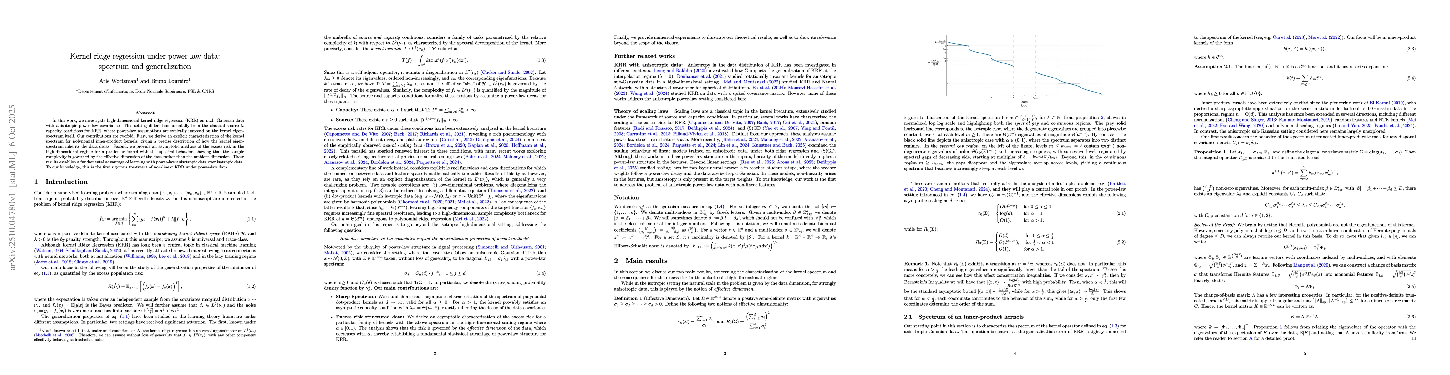 In this work, we investigate high-dimensional kernel ridge regression (KRR) on i.i.d. Gaussian data with anisotropic power-law covariance. This setting differs fundamentally from the classical source & capacity conditions for KRR, where power-law assumptions are typically imposed on the kernel eigen-spectrum itself. Our contributions are twofold. First, we derive an explicit characterization of the kernel spectrum for polynomial inner-product kernels, giving a precise description of how the kernel eigen-spectrum inherits the data decay. Second, we provide an asymptotic analysis of the excess risk in the high-dimensional regime for a particular kernel with this spectral behavior, showing that the sample complexity is governed by the effective dimension of the data rather than the ambient dimension. These results establish a fundamental advantage of learning with power-law anisotropic data over isotropic data. To our knowledge, this is the first rigorous treatment of non-linear KRR under power-law data.