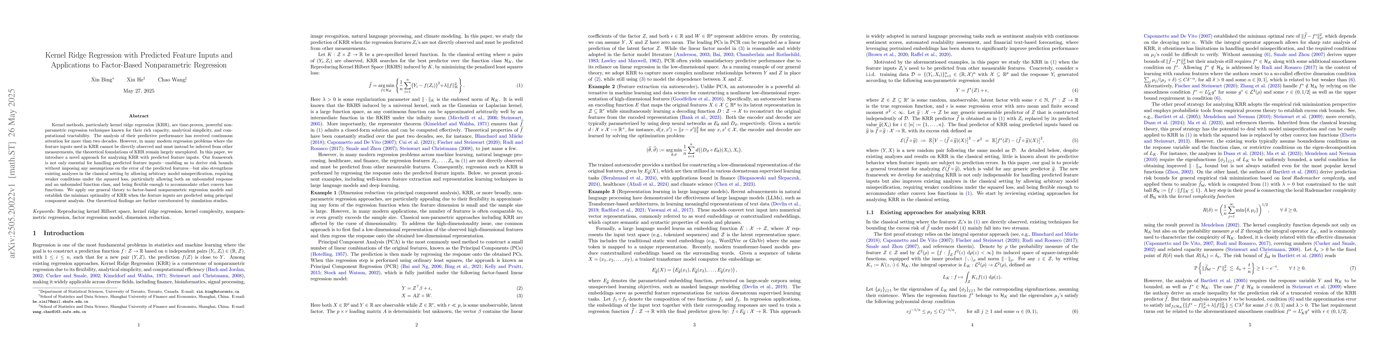 This research is important as it extends the theoretical foundations of KRR to modern regression problems where feature inputs are inferred, addressing gaps in existing analyses and providing a robust framework for factor-based nonparametric regression.