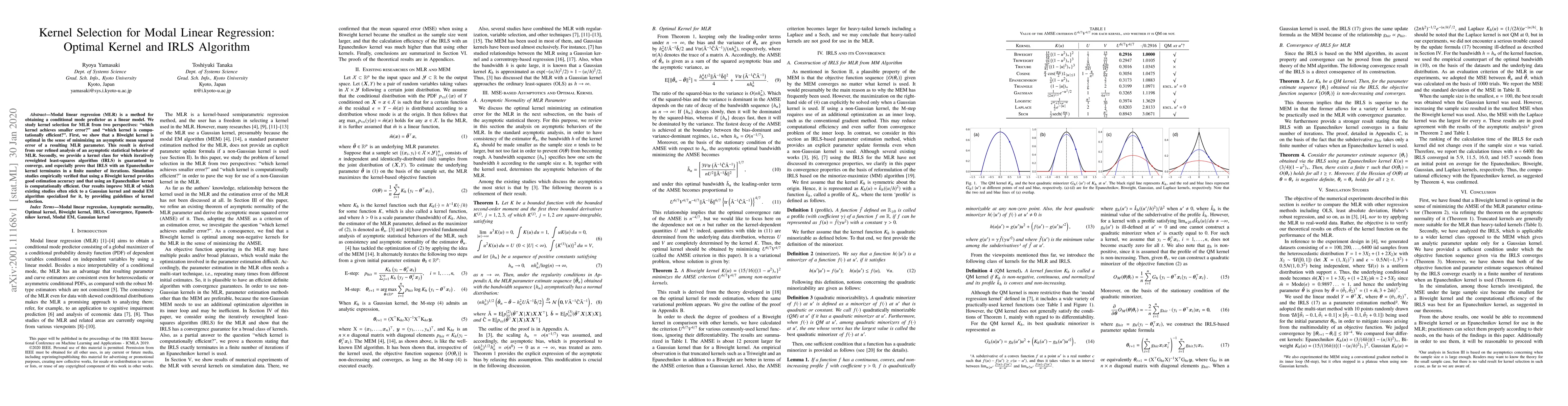 Modal linear regression (MLR) is a method for obtaining a conditional mode predictor as a linear model. We study kernel selection for MLR from two perspectives: "which kernel achieves smaller error?" and "which kernel is computationally efficient?". First, we show that a Biweight kernel is optimal in the sense of minimizing an asymptotic mean squared error of a resulting MLR parameter. This result is derived from our refined analysis of an asymptotic statistical behavior of MLR. Secondly, we provide a kernel class for which iteratively reweighted least-squares algorithm (IRLS) is guaranteed to converge, and especially prove that IRLS with an Epanechnikov kernel terminates in a finite number of iterations. Simulation studies empirically verified that using a Biweight kernel provides good estimation accuracy and that using an Epanechnikov kernel is computationally efficient. Our results improve MLR of which existing studies often stick to a Gaussian kernel and modal EM algorithm specialized for it, by providing guidelines of kernel selection.