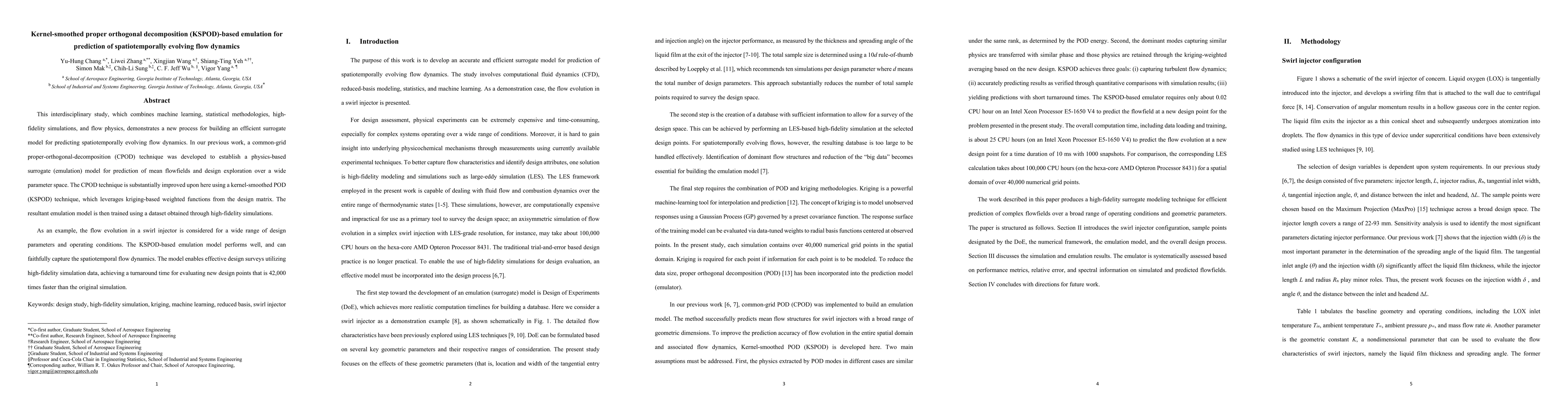 This interdisciplinary study, which combines machine learning, statistical methodologies, high-fidelity simulations, and flow physics, demonstrates a new process for building an efficient surrogate model for predicting spatiotemporally evolving flow dynamics. In our previous work, a common-grid proper-orthogonal-decomposition (CPOD) technique was developed to establish a physics-based surrogate (emulation) model for prediction of mean flowfields and design exploration over a wide parameter space. The CPOD technique is substantially improved upon here using a kernel-smoothed POD (KSPOD) technique, which leverages kriging-based weighted functions from the design matrix. The resultant emulation model is then trained using a dataset obtained through high-fidelity simulations. As an example, the flow evolution in a swirl injector is considered for a wide range of design parameters and operating conditions. The KSPOD-based emulation model performs well, and can faithfully capture the spatiotemporal flow dynamics. The model enables effective design surveys utilizing high-fidelity simulation data, achieving a turnaround time for evaluating new design points that is 42,000 times faster than the original simulation.