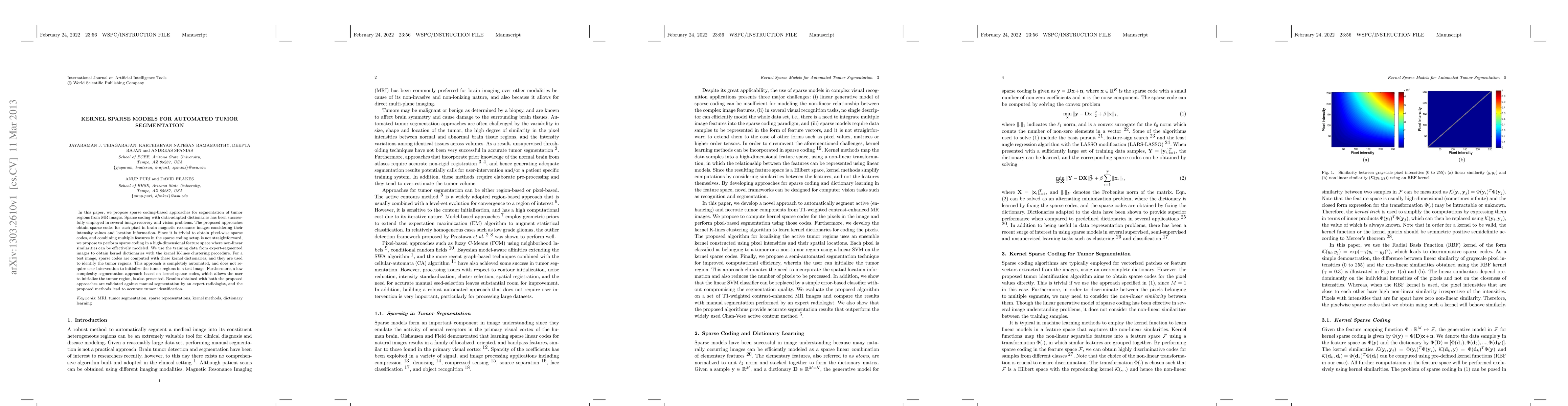 In this paper, we propose sparse coding-based approaches for segmentation of tumor regions from MR images. Sparse coding with data-adapted dictionaries has been successfully employed in several image recovery and vision problems. The proposed approaches obtain sparse codes for each pixel in brain magnetic resonance images considering their intensity values and location information. Since it is trivial to obtain pixel-wise sparse codes, and combining multiple features in the sparse coding setup is not straightforward, we propose to perform sparse coding in a high-dimensional feature space where non-linear similarities can be effectively modeled. We use the training data from expert-segmented images to obtain kernel dictionaries with the kernel K-lines clustering procedure. For a test image, sparse codes are computed with these kernel dictionaries, and they are used to identify the tumor regions. This approach is completely automated, and does not require user intervention to initialize the tumor regions in a test image. Furthermore, a low complexity segmentation approach based on kernel sparse codes, which allows the user to initialize the tumor region, is also presented. Results obtained with both the proposed approaches are validated against manual segmentation by an expert radiologist, and the proposed methods lead to accurate tumor identification.