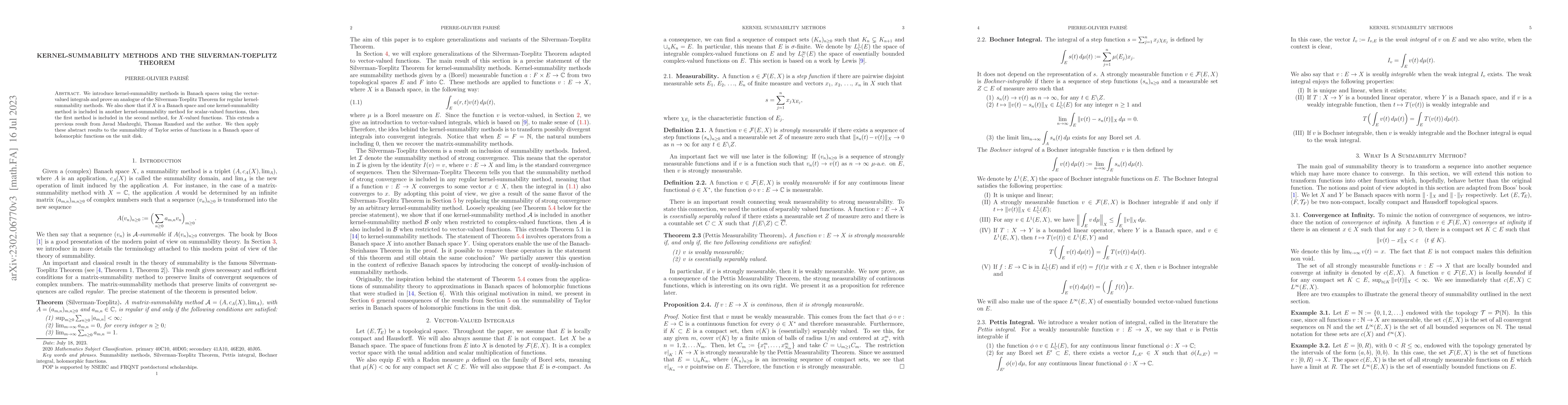 We introduce kernel-summability methods in Banach spaces using the vector-valued integrals and prove an analogue of the Silverman-Toeplitz Theorem for regular kernel-summability methods. We also show that if $X$ is a Banach space and one kernel-summability method is included in another kernel-summability method for scalar-valued functions, then the first method is included in the second method, for $X$-valued functions. This extends a previous result from Javad Mashreghi, Thomas Ransford and the author. We then apply these abstract results to the summability of Taylor series of functions in a Banach space of holomorphic functions on the unit disk.