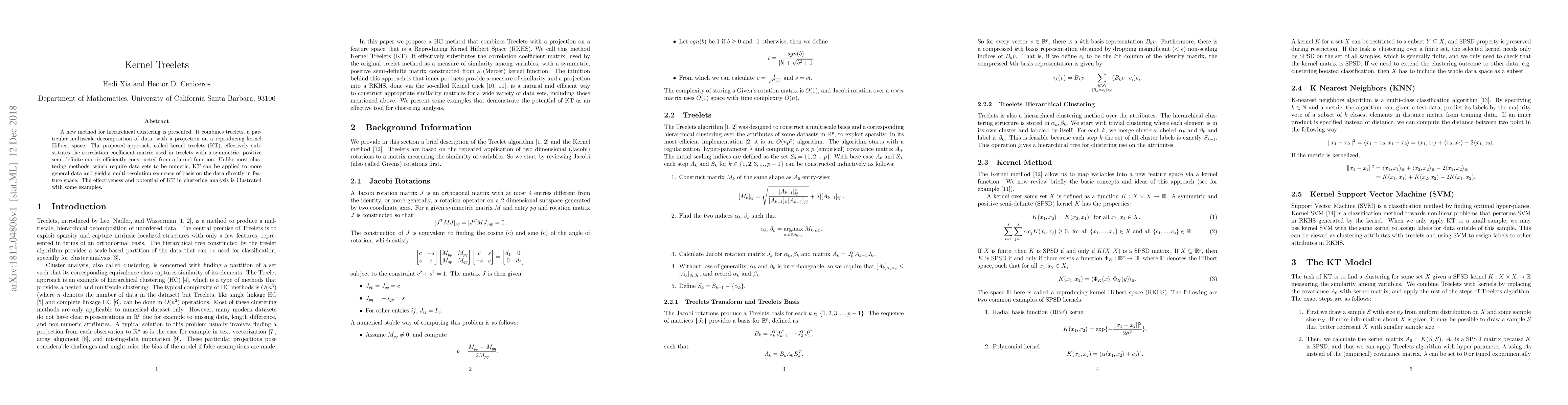 A new method for hierarchical clustering is presented. It combines treelets, a particular multiscale decomposition of data, with a projection on a reproducing kernel Hilbert space. The proposed approach, called kernel treelets (KT), effectively substitutes the correlation coefficient matrix used in treelets with a symmetric, positive semi-definite matrix efficiently constructed from a kernel function. Unlike most clustering methods, which require data sets to be numeric, KT can be applied to more general data and yield a multi-resolution sequence of basis on the data directly in feature space. The effectiveness and potential of KT in clustering analysis is illustrated with some examples.