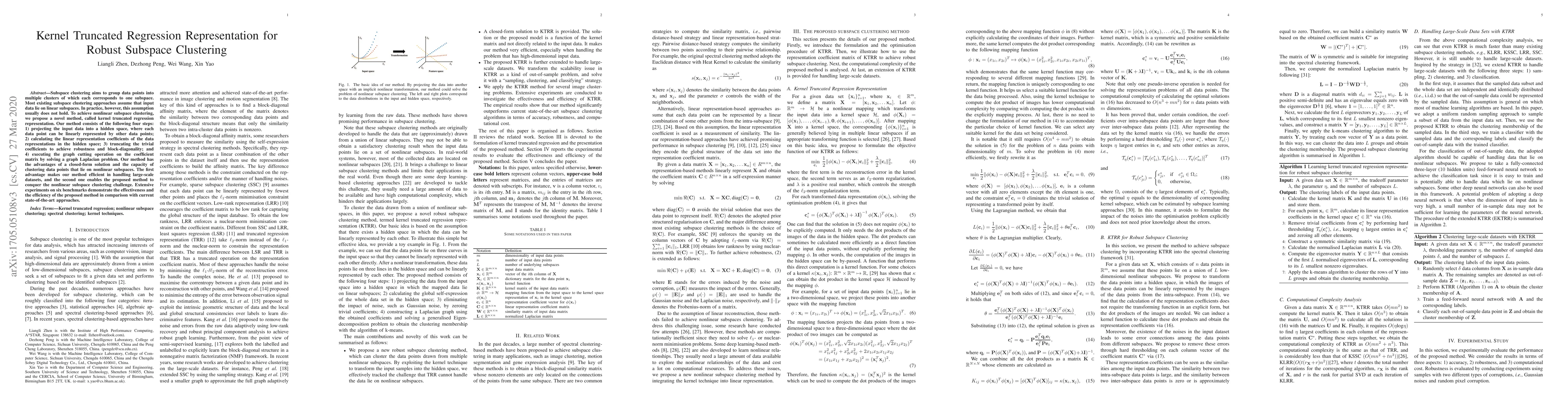 A new method called kernel truncated regression representation is proposed for robust subspace clustering, enabling non-linear subspace clustering with a closed-form solution and efficient handling of large-scale datasets.