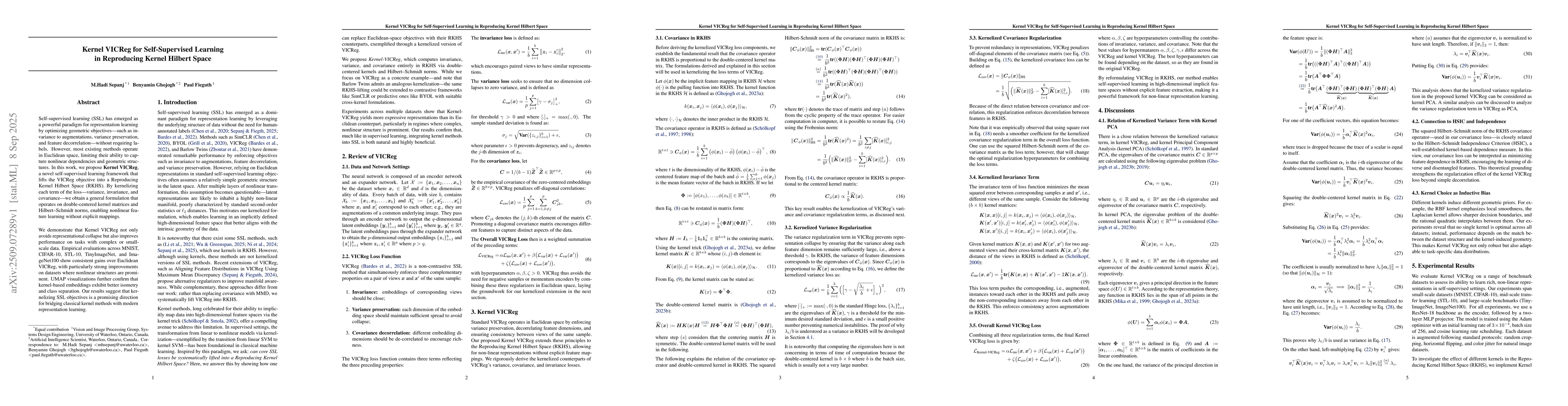 Self-supervised learning (SSL) has emerged as a powerful paradigm for representation learning by optimizing geometric objectives--such as invariance to augmentations, variance preservation, and feature decorrelation--without requiring labels. However, most existing methods operate in Euclidean space, limiting their ability to capture nonlinear dependencies and geometric structures. In this work, we propose Kernel VICReg, a novel self-supervised learning framework that lifts the VICReg objective into a Reproducing Kernel Hilbert Space (RKHS). By kernelizing each term of the loss-variance, invariance, and covariance--we obtain a general formulation that operates on double-centered kernel matrices and Hilbert-Schmidt norms, enabling nonlinear feature learning without explicit mappings. We demonstrate that Kernel VICReg not only avoids representational collapse but also improves performance on tasks with complex or small-scale data. Empirical evaluations across MNIST, CIFAR-10, STL-10, TinyImageNet, and ImageNet100 show consistent gains over Euclidean VICReg, with particularly strong improvements on datasets where nonlinear structures are prominent. UMAP visualizations further confirm that kernel-based embeddings exhibit better isometry and class separation. Our results suggest that kernelizing SSL objectives is a promising direction for bridging classical kernel methods with modern representation learning.