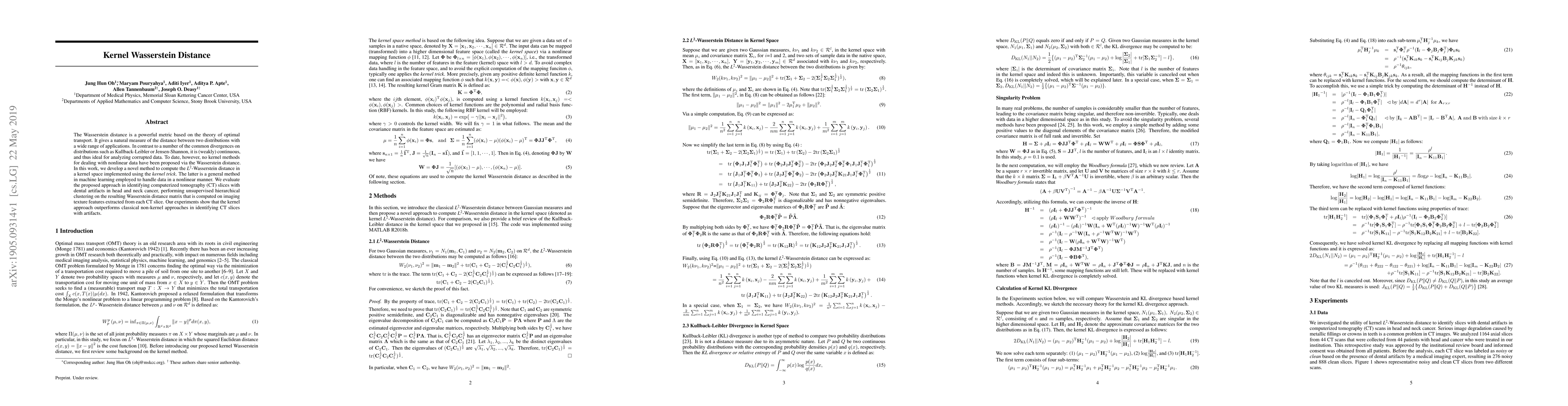 This paper introduces a novel method for computing the L2-Wasserstein distance in a kernel space, enabling the analysis of nonlinear data. Experiments on identifying CT slices with dental artifacts demonstrate that the proposed kernel-based approach outperforms traditional non-kernel methods.