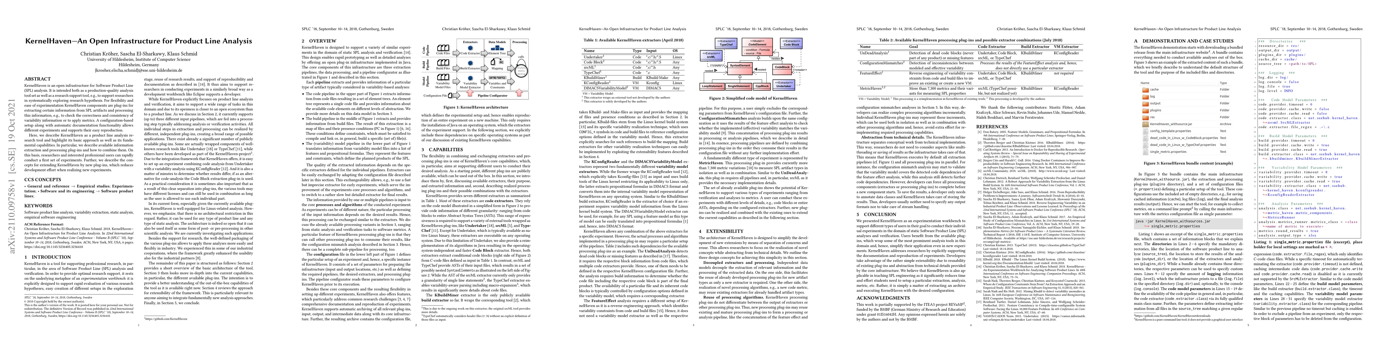 KernelHaven is an open infrastructure for analyzing Software Product Lines, offering flexibility and ease of experimentation with customizable plug-ins and automatic documentation. It supports researchers in systematically exploring research hypotheses and can be easily extended by new plug-ins.