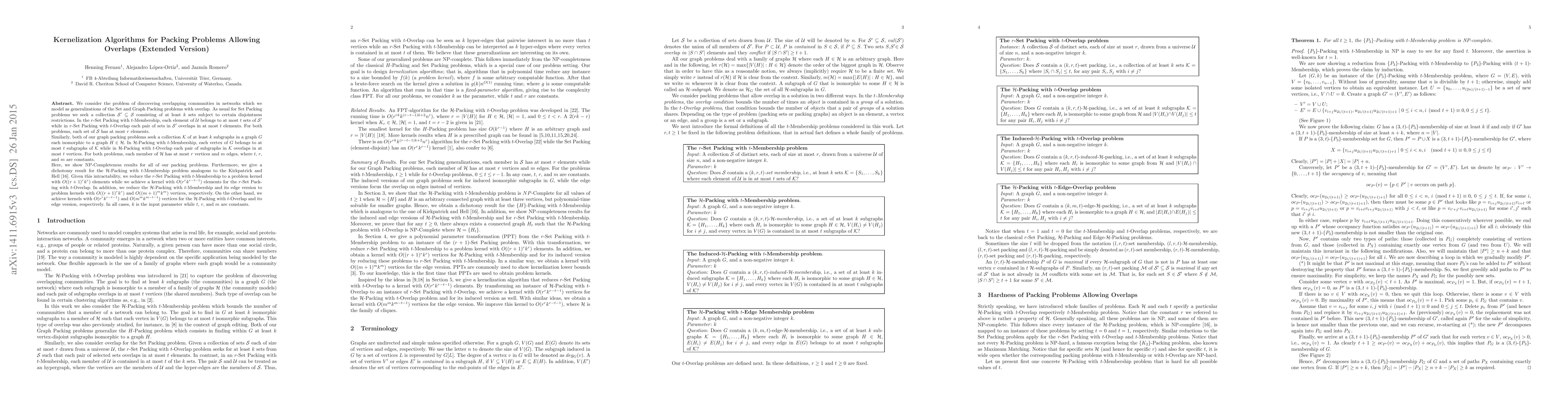 We consider the problem of discovering overlapping communities in networks which we model as generalizations of Graph Packing problems with overlap. We seek a collection $\mathcal{S}' \subseteq \mathcal{S}$ consisting of at least $k$ sets subject to certain disjointness restrictions. In the $r$-Set Packing with $t$-Membership, each element of $\mathcal{U}$ belongs to at most $t$ sets of $\mathcal{S'}$ while in $t$-Overlap each pair of sets in $\mathcal{S'}$ overlaps in at most $t$ elements. Each set of $\mathcal{S}$ has at most $r$ elements. Similarly, both of our graph packing problems seek a collection $\mathcal{K}$ of at least $k$ subgraphs in a graph $G$ each isomorphic to a graph $H \in \mathcal{H}$. In $\mathcal{H}$-Packing with $t$-Membership, each vertex of $G$ belongs to at most $t$ subgraphs of $\mathcal{K}$ while in $t$-Overlap each pair of subgraphs in $\mathcal{K}$ overlaps in at most $t$ vertices. Each member of $\mathcal{H}$ has at most $r$ vertices and $m$ edges. We show NP-Completeness results for all of our packing problems and we give a dichotomy result for the $\mathcal{H}$-Packing with $t$-Membership problem analogous to the Kirkpatrick and Hell \cite{Kirk78}. We reduce the $r$-Set Packing with $t$-Membership to a problem kernel with $O((r+1)^r k^{r})$ elements while we achieve a kernel with $O(r^r k^{r-t-1})$ elements for the $r$-Set Packing with $t$-Overlap. In addition, we reduce the $\mathcal{H}$-Packing with $t$-Membership and its edge version to problem kernels with $O((r+1)^r k^{r})$ and $O((m+1)^{m} k^{{m}})$ vertices, respectively. On the other hand, we achieve kernels with $O(r^r k^{r-t-1})$ and $O(m^{m} k^{m-t-1})$ vertices for the $\mathcal{H}$-Packing with $t$-Overlap and its edge version, respectively. In all cases, $k$ is the input parameter while $t$, $r$, and $m$ are constants.