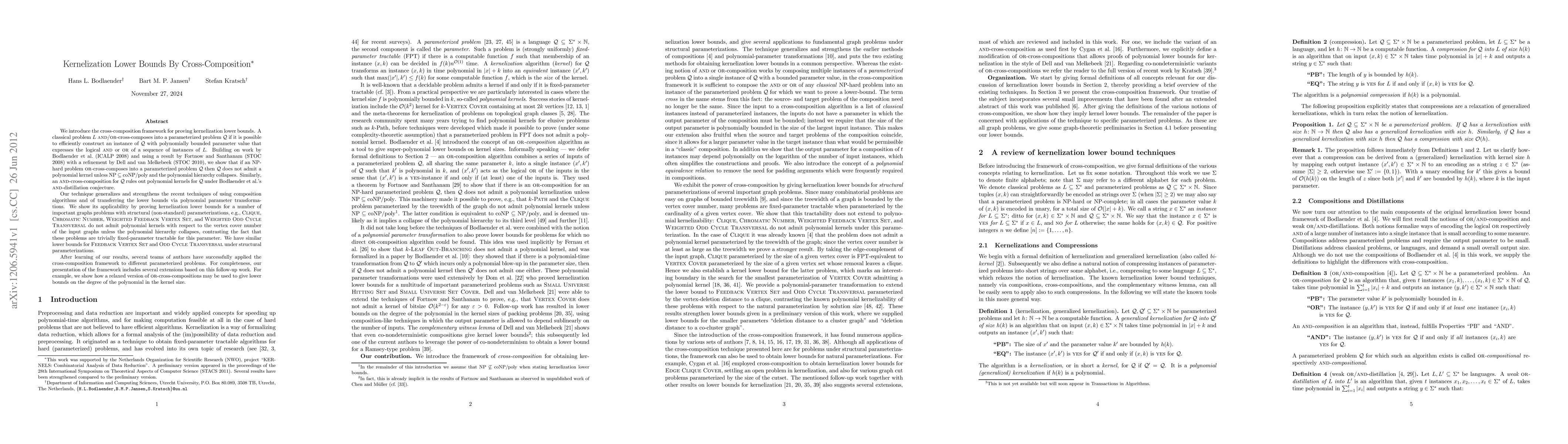 The paper introduces a cross-composition framework for establishing kernelization lower bounds and demonstrates its application to several graph problems, showing they do not admit polynomial kernels unless the polynomial hierarchy collapses. It generalizes existing techniques and has inspired further applications to parameterized problems.