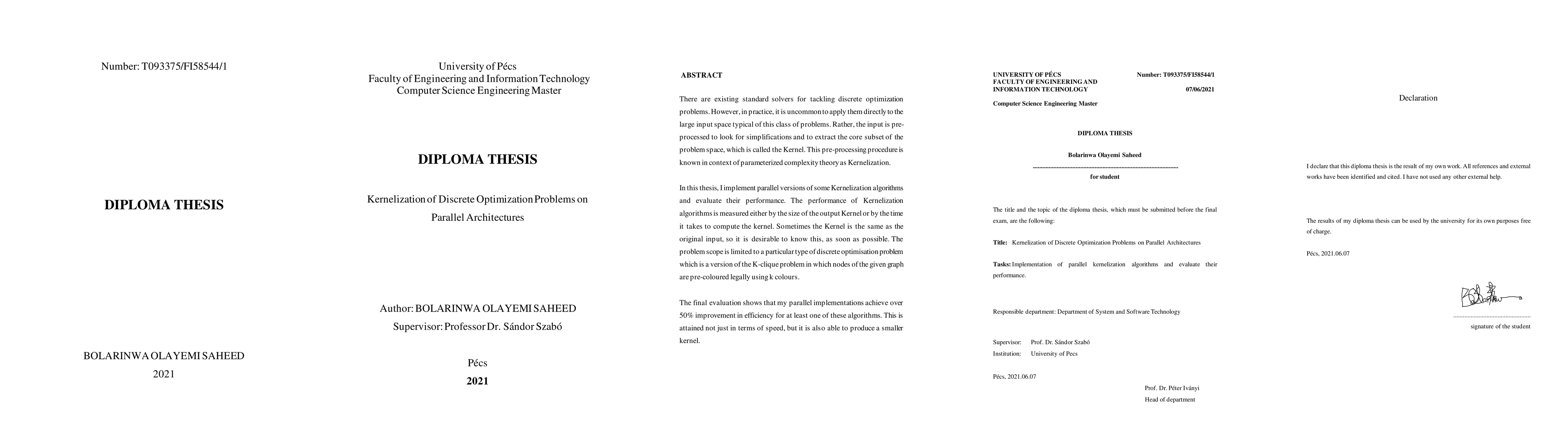 There are existing standard solvers for tackling discrete optimization problems. However, in practice, it is uncommon to apply them directly to the large input space typical of this class of problems. Rather, the input is preprocessed to look for simplifications and to extract the core subset of the problem space, which is called the Kernel. This pre-processing procedure is known in the context of parameterized complexity theory as Kernelization. In this thesis, I implement parallel versions of some Kernelization algorithms and evaluate their performance. The performance of Kernelization algorithms is measured either by the size of the output Kernel or by the time it takes to compute the kernel. Sometimes the Kernel is the same as the original input, so it is desirable to know this, as soon as possible. The problem scope is limited to a particular type of discrete optimisation problem which is a version of the K-clique problem in which nodes of the given graph are pre-coloured legally using k colours. The final evaluation shows that my parallel implementations achieve over 50% improvement in efficiency for at least one of these algorithms. This is attained not just in terms of speed, but it is also able to produce a smaller kernel.