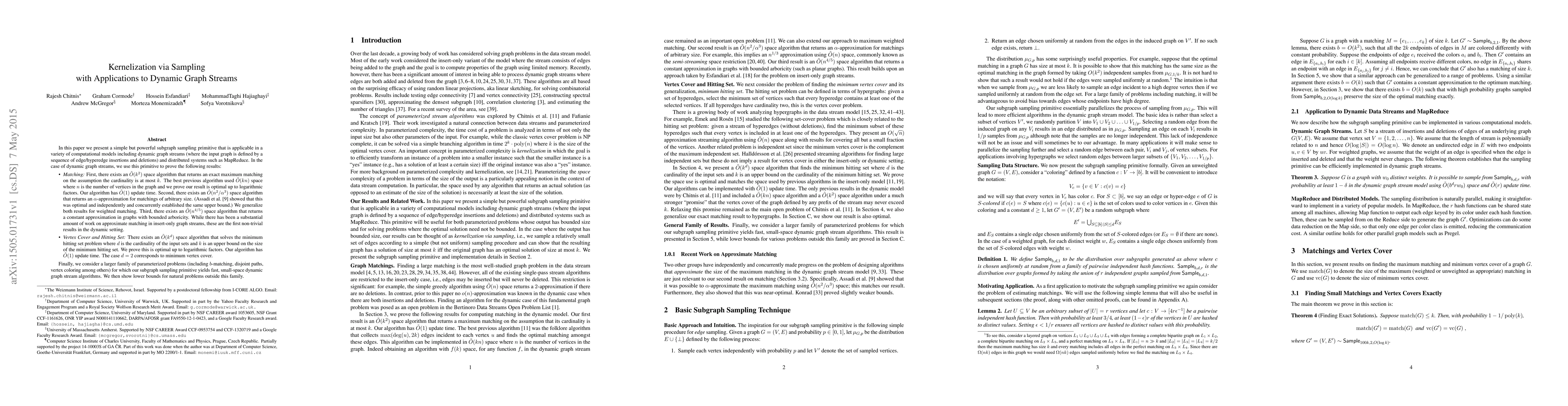 In this paper we present a simple but powerful subgraph sampling primitive that is applicable in a variety of computational models including dynamic graph streams (where the input graph is defined by a sequence of edge/hyperedge insertions and deletions) and distributed systems such as MapReduce. In the case of dynamic graph streams, we use this primitive to prove the following results: -- Matching: First, there exists an $\tilde{O}(k^2)$ space algorithm that returns an exact maximum matching on the assumption the cardinality is at most $k$. The best previous algorithm used $\tilde{O}(kn)$ space where $n$ is the number of vertices in the graph and we prove our result is optimal up to logarithmic factors. Our algorithm has $\tilde{O}(1)$ update time. Second, there exists an $\tilde{O}(n^2/\alpha^3)$ space algorithm that returns an $\alpha$-approximation for matchings of arbitrary size. (Assadi et al. (2015) showed that this was optimal and independently and concurrently established the same upper bound.) We generalize both results for weighted matching. Third, there exists an $\tilde{O}(n^{4/5})$ space algorithm that returns a constant approximation in graphs with bounded arboricity. -- Vertex Cover and Hitting Set: There exists an $\tilde{O}(k^d)$ space algorithm that solves the minimum hitting set problem where $d$ is the cardinality of the input sets and $k$ is an upper bound on the size of the minimum hitting set. We prove this is optimal up to logarithmic factors. Our algorithm has $\tilde{O}(1)$ update time. The case $d=2$ corresponds to minimum vertex cover. Finally, we consider a larger family of parameterized problems (including $b$-matching, disjoint paths, vertex coloring among others) for which our subgraph sampling primitive yields fast, small-space dynamic graph stream algorithms. We then show lower bounds for natural problems outside this family.