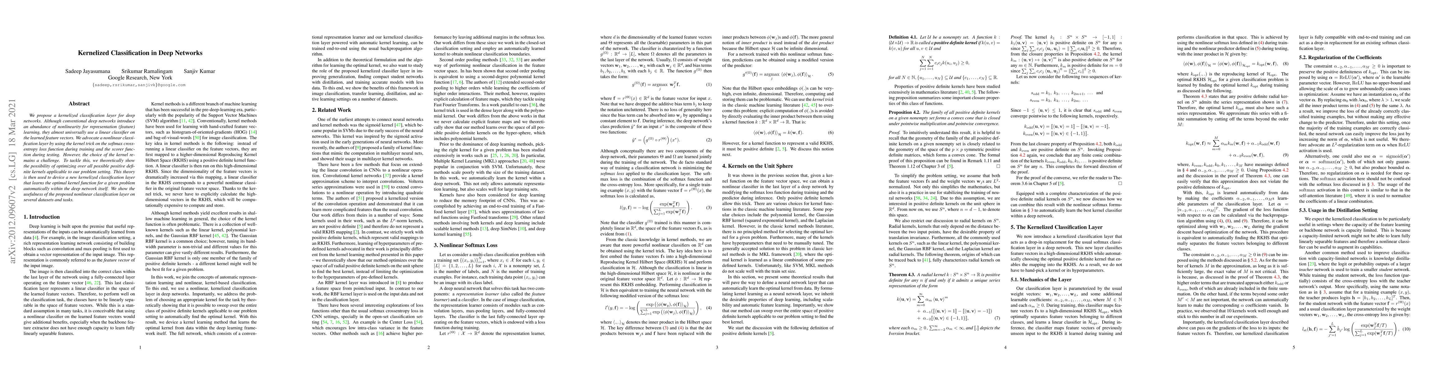 This research introduces a kernelized classification layer for deep networks, addressing the limitation of conventional linear classifiers. The proposed method automatically learns the optimal kernel function within the network itself, demonstrating effectiveness on various datasets and tasks.