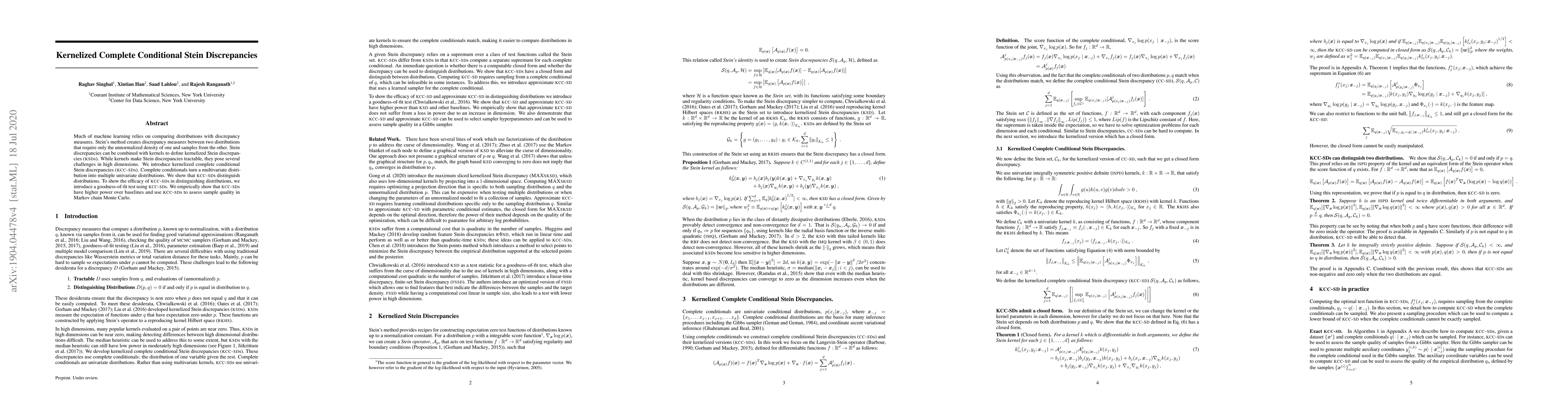 This paper introduces kernelized complete conditional Stein discrepancies (KCC-SDs) to improve distribution comparison in machine learning. It demonstrates their effectiveness in distinguishing distributions through a goodness-of-fit test and assessing sample quality in Markov chain Monte Carlo simulations.