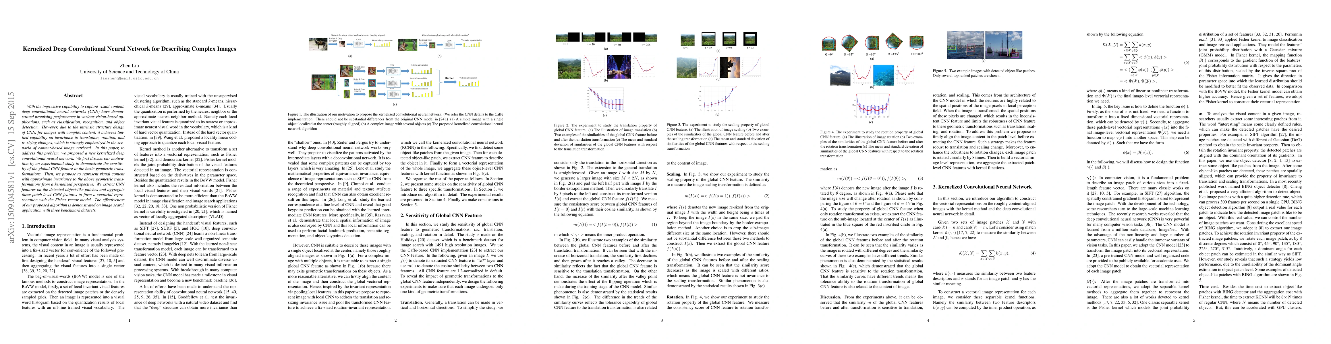 With the impressive capability to capture visual content, deep convolutional neural networks (CNN) have demon- strated promising performance in various vision-based ap- plications, such as classification, recognition, and objec- t detection. However, due to the intrinsic structure design of CNN, for images with complex content, it achieves lim- ited capability on invariance to translation, rotation, and re-sizing changes, which is strongly emphasized in the s- cenario of content-based image retrieval. In this paper, to address this problem, we proposed a new kernelized deep convolutional neural network. We first discuss our motiva- tion by an experimental study to demonstrate the sensitivi- ty of the global CNN feature to the basic geometric trans- formations. Then, we propose to represent visual content with approximate invariance to the above geometric trans- formations from a kernelized perspective. We extract CNN features on the detected object-like patches and aggregate these patch-level CNN features to form a vectorial repre- sentation with the Fisher vector model. The effectiveness of our proposed algorithm is demonstrated on image search application with three benchmark datasets.