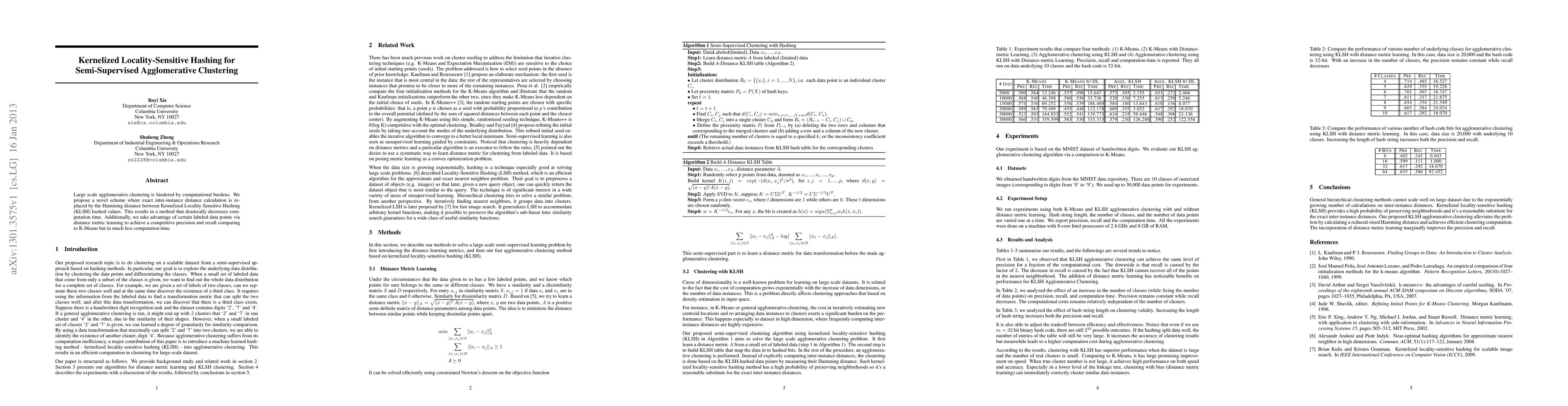 This paper proposes a Kernelized Locality-Sensitive Hashing (KLSH) method for semi-supervised agglomerative clustering, replacing exact distance calculations with Hamming distances between hashed values to significantly reduce computational time. It also incorporates labeled data through distance metric learning to achieve high precision and recall compared to K-Means, while being much faster.
