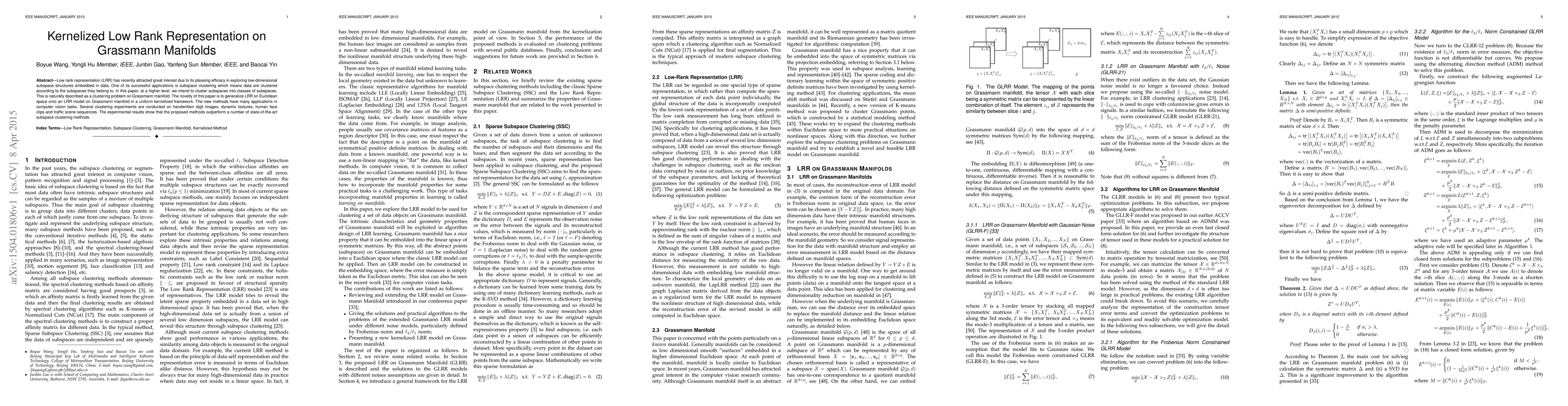 This paper proposes a kernelized low rank representation model on Grassmann manifolds for subspace clustering, generalizing LRR from Euclidean space. Experiments on various image datasets demonstrate superior performance compared to existing methods.