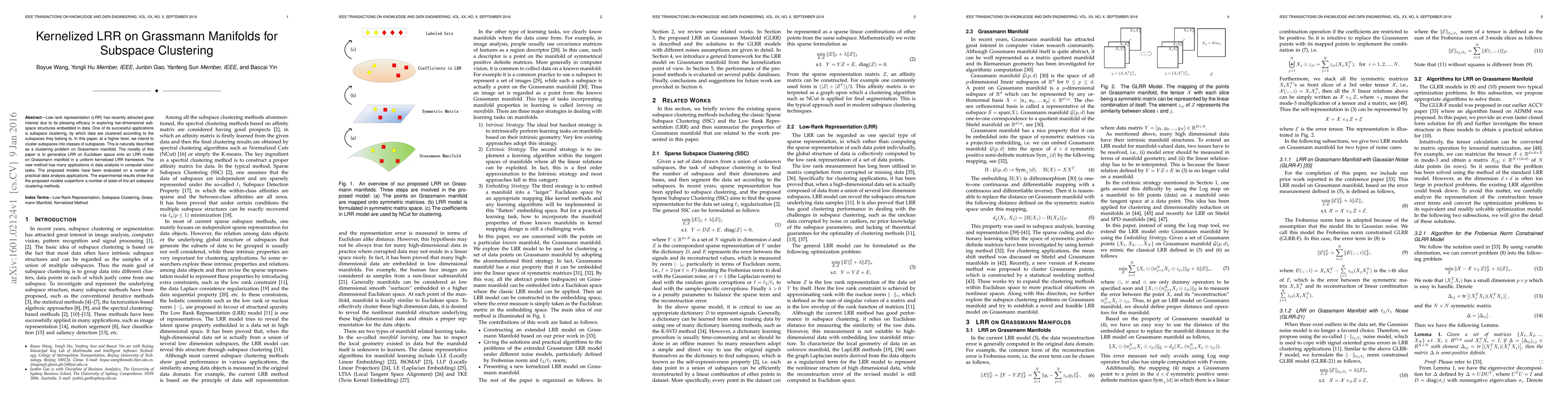 This paper proposes a kernelized LRR model on Grassmann manifolds for subspace clustering, effectively generalizing LRR from Euclidean space to a new framework that clusters data according to their subspaces. Experimental results demonstrate superior performance compared to state-of-the-art methods in various computer vision tasks.