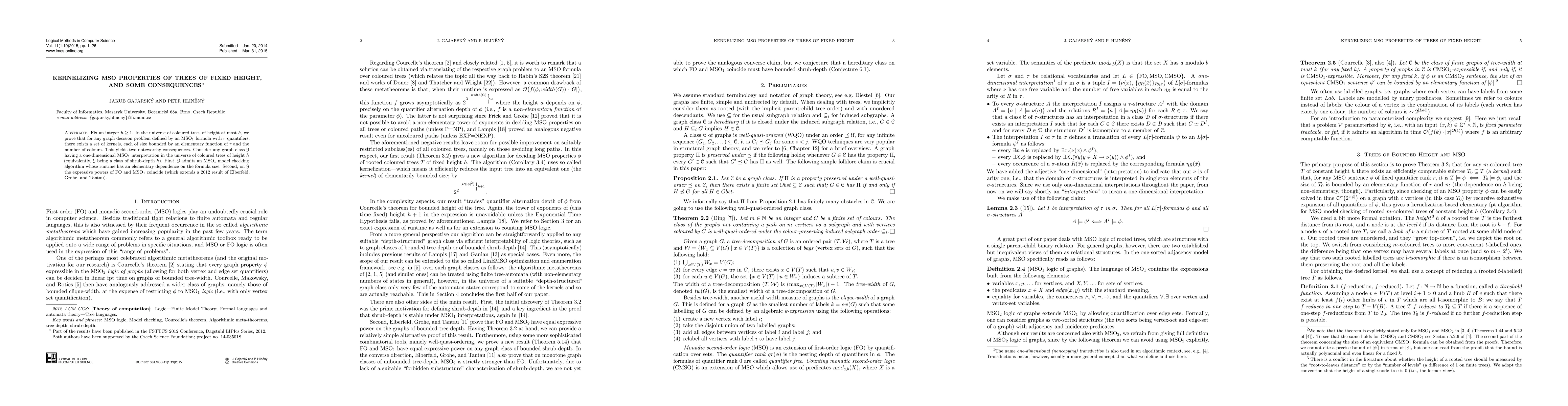 This paper proves that for any MSO formula defining a graph decision problem on trees of fixed height h, there exists a kernel of bounded size, leading to efficient MSO model checking algorithms and showing that first-order and MSO logics have the same expressive power for such graph classes.