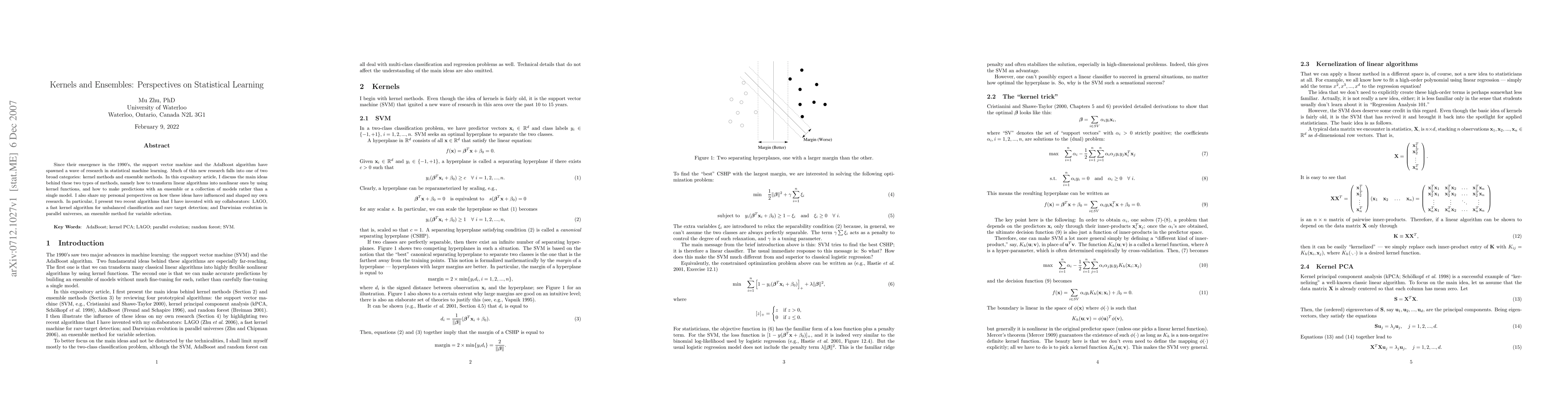 This paper explores two key areas of statistical learning: kernel methods and ensemble methods, discussing their main ideas and the author's personal perspectives on these concepts. It also introduces new algorithms, including LAGO for unbalanced classification and Darwinian evolution in parallel universes for variable selection.