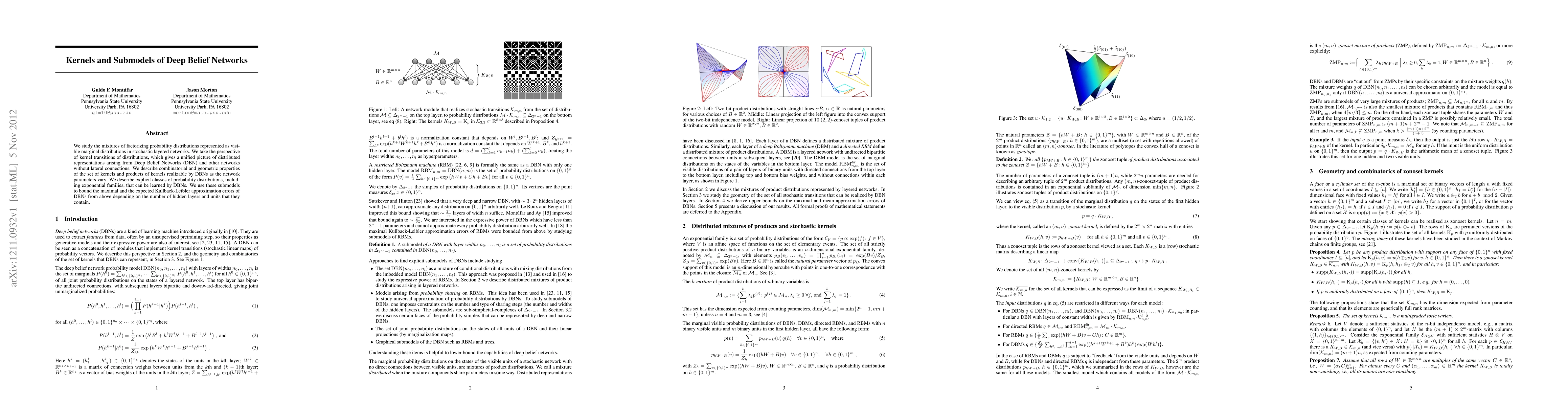 Researchers studied Deep Belief Networks (DBNs) and found that their distributed representations can be understood through kernel transitions of probability distributions, enabling the identification of explicit classes of learnable submodels.