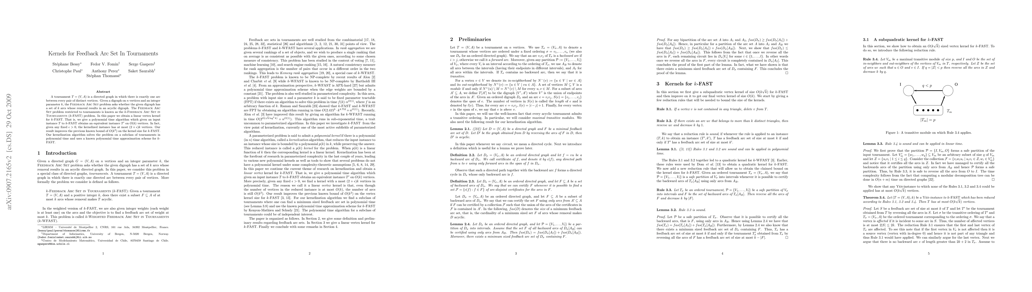 This paper presents a linear vertex kernel for the k-Feedback Arc Set in Tournaments (k-FAST) problem, improving the previous O(k^2) kernel size bound to O(k) vertices. The algorithm achieves this by solving a subclass of tournaments in polynomial time and utilizing a known polynomial time approximation scheme.