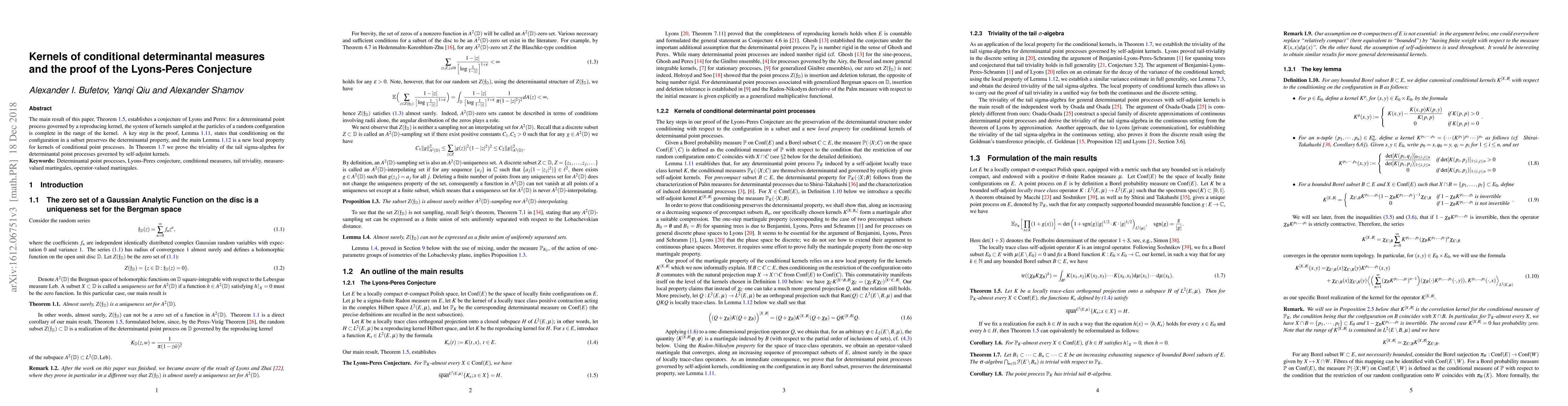 This paper proves the Lyons-Peres Conjecture by demonstrating that the kernels of a determinantal point process, sampled at random configuration particles, are complete in the kernel's range. The proof hinges on Lemma 1.11, which shows that conditioning on a subset preserves the determinantal property, and Lemma 1.12, which introduces a new local property for conditional kernels.