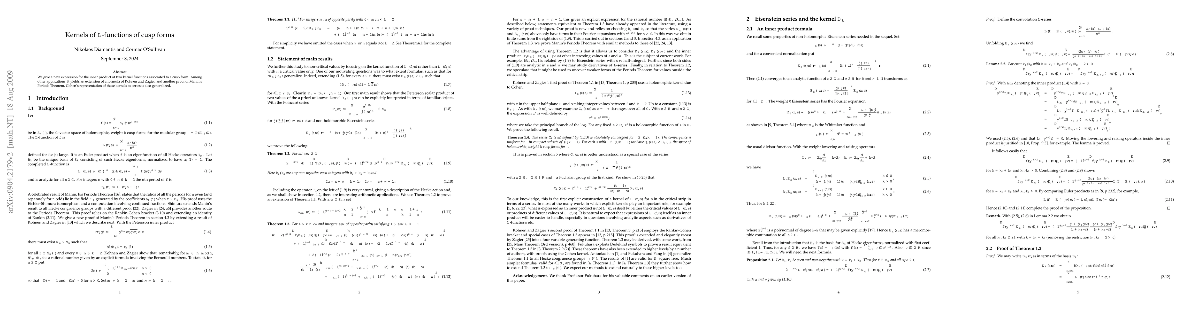 This paper presents a new expression for the inner product of kernel functions linked to cusp forms, extending Kohnen and Zagier's formula and providing another proof of Manin's Periods Theorem, while also generalizing Cohen's series representation of these kernels.