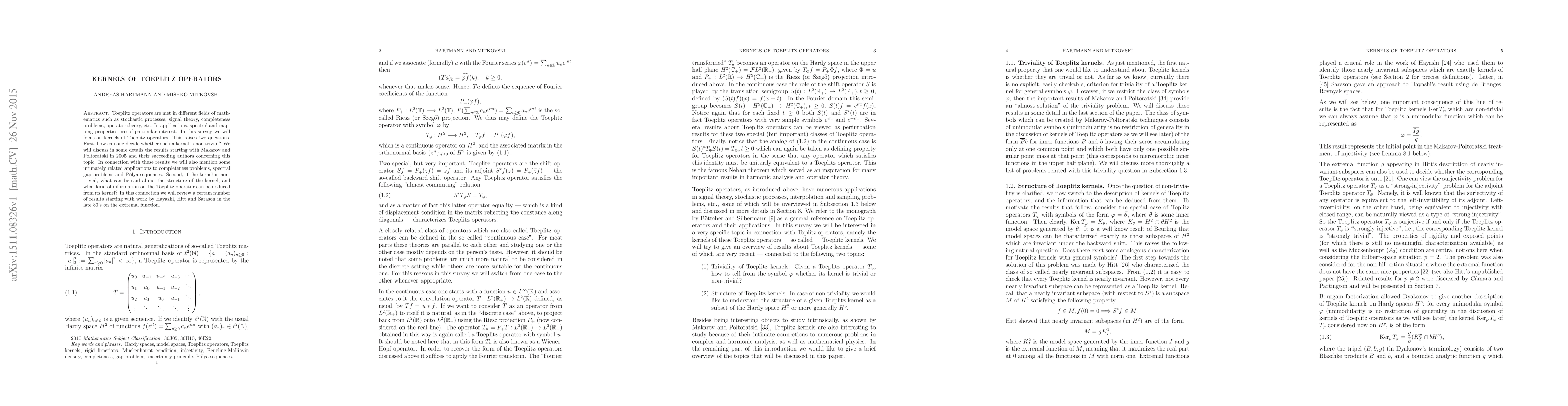 This paper surveys the kernels of Toeplitz operators, focusing on determining non-trivial kernels and their structural implications. It discusses recent results and applications, including completeness problems and spectral gap problems, and reviews foundational work on the extremal function.