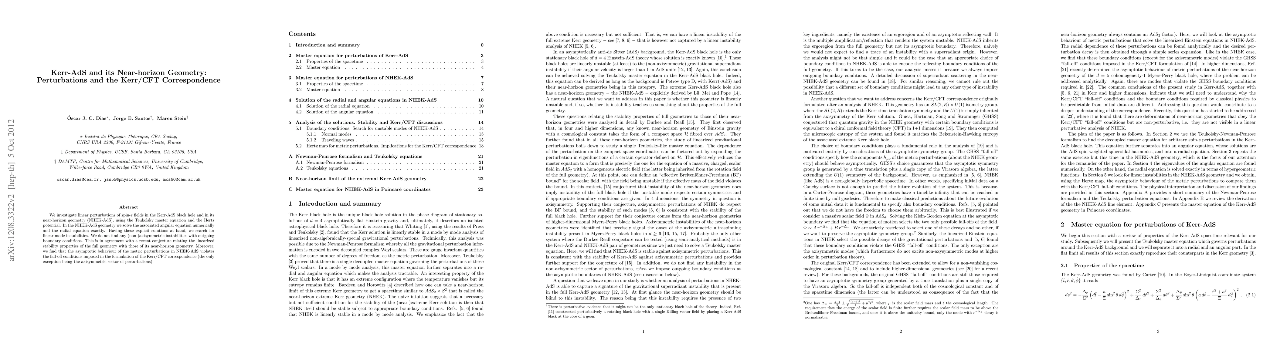 This paper studies linear perturbations of spin-s fields in Kerr-AdS black holes and their near-horizon geometry (NHEK-AdS), finding no non-axisymmetric instabilities, and notes that NHEK-AdS metric perturbations do not satisfy the Kerr/CFT correspondence's fall-off conditions, except for axisymmetric perturbations.
