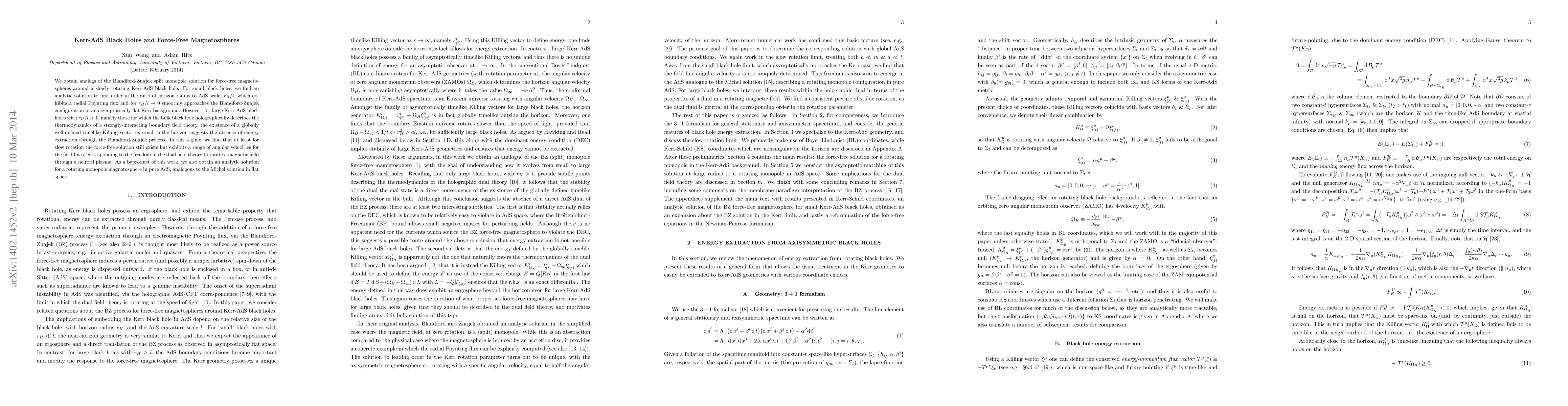 This paper explores force-free magnetospheres around slowly rotating Kerr-AdS black holes, deriving an analytic solution for small black holes that resembles the Blandford-Znajek configuration. For large black holes, it finds no energy extraction through the Blandford-Znajek process, instead revealing a range of angular velocities for field lines related to dual field theory dynamics.