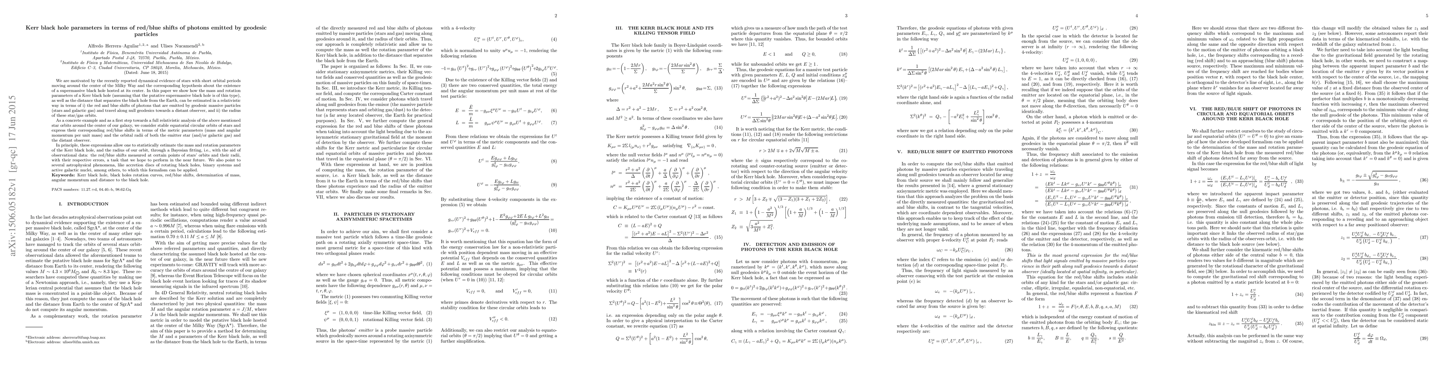 This paper proposes a method to estimate the mass and rotation parameters of a Kerr black hole, as well as the distance to it, using the red/blue shifts of photons emitted by orbiting particles and their orbital radii. The approach aims to statistically infer these parameters through Bayesian fitting using observational data.
