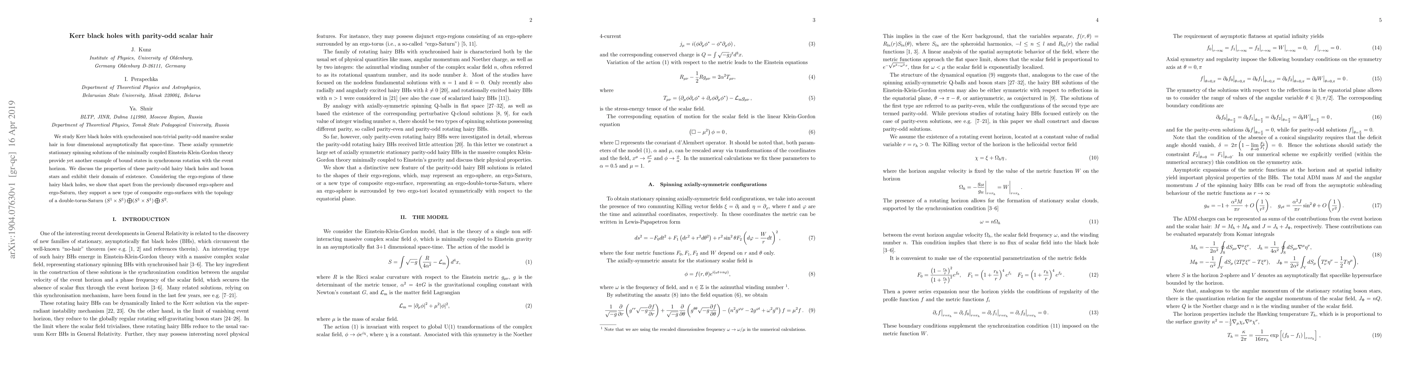 We study Kerr black holes with synchronised non-trivial parity-odd massive scalar hair in four dimensional asymptotically flat space-time. These axially symmetric stationary spinning solutions of the minimally coupled Einstein-Klein-Gordon theory provide yet another example of bound states in synchronous rotation with the event horizon. We discuss the properties of these parity-odd hairy black holes and boson stars and exhibit their domain of existence. Considering the ergo-regions of these hairy black holes, we show that apart from the previously discussed ergo-sphere and ergo-Saturn, they support a new type of composite ergo-surfaces with the topology of a double-torus-Saturn $(S^1\times S^1)\bigoplus(S^1\times S^1)\bigoplus S^2$.