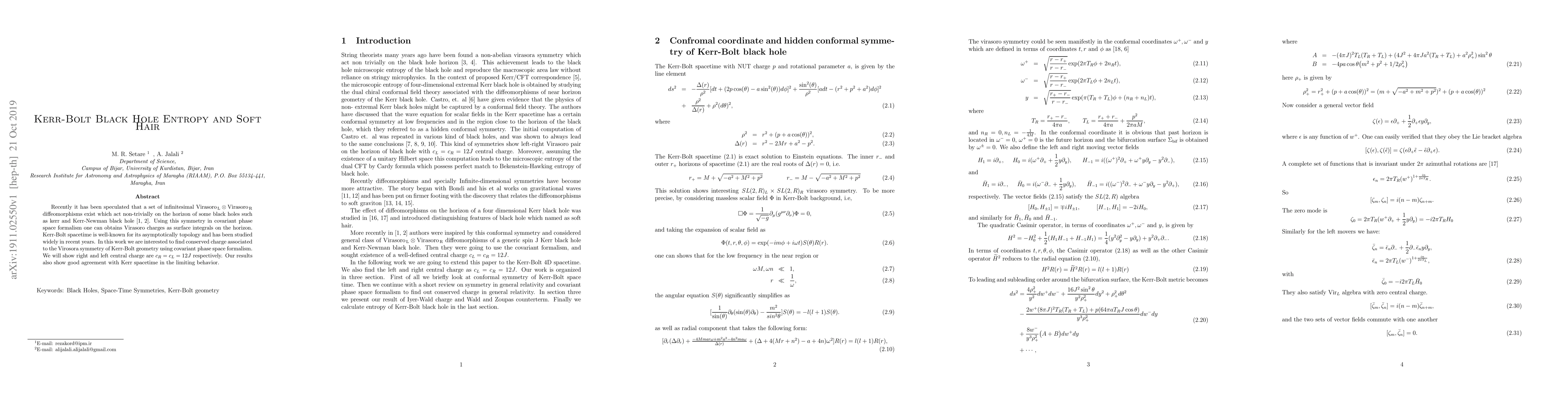 Recently it has been speculated that a set of infinitesimal ${\rm Virasoro_{\,L}}\otimes{\rm Virasoro_{\,R}}$ diffeomorphisms exist which act non-trivially on the horizon of some black holes such as kerr and Kerr-Newman black hole \cite{Haco:2018ske,Haco:2019ggi}. Using this symmetry in covariant phase space formalism one can obtains Virasoro charges as surface integrals on the horizon. Kerr-Bolt spacetime is well-known for its asymptotically topology and has been studied widely in recent years. In this work we are interested to find conserved charge associated to the Virosora symmetry of Kerr-Bolt geometry using covariant phase space formalism. We will show right and left central charge are $c_R=c_L=12 J$ respectively. Our results also show good agreement with Kerr spacetime in the limiting behavior.