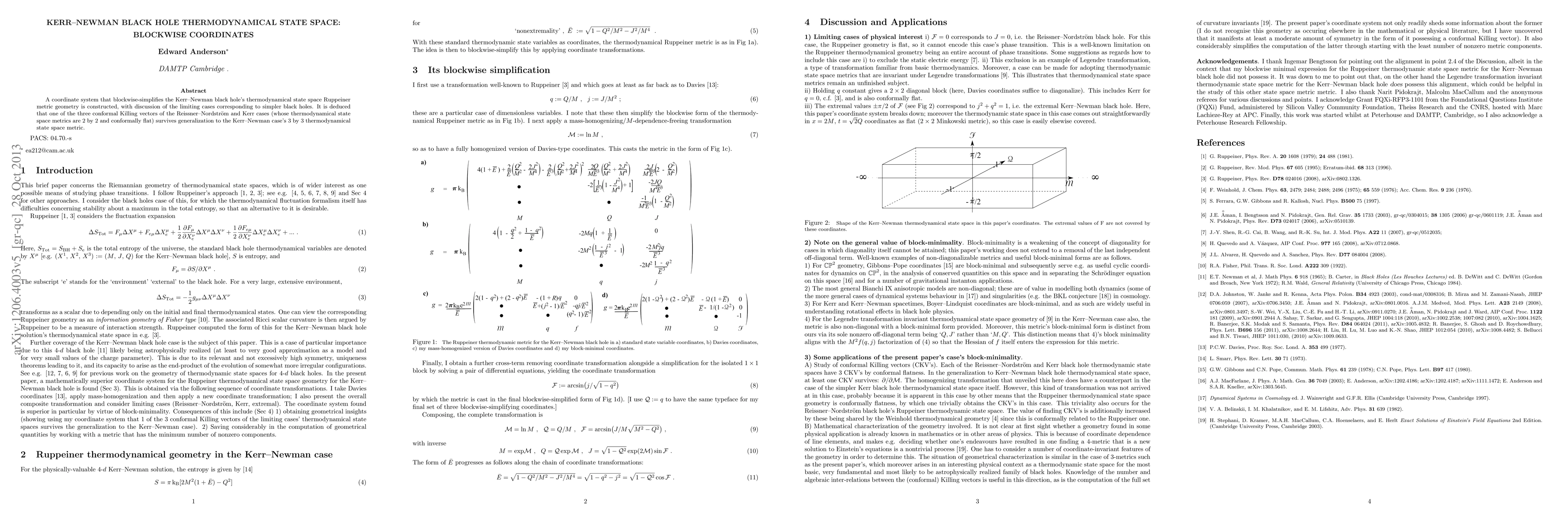 A coordinate system that blockwise-simplifies the Kerr-Newman black hole's thermodynamical state space Ruppeiner metric geometry is constructed, with discussion of the limiting cases corresponding to simpler black holes. It is deduced that one of the three conformal Killing vectors of the Reissner-Nordstrom and Kerr cases (whose thermodynamical state space metrics are 2 by 2 and conformally flat) survives generalization to the Kerr-Newman case's 3 by 3 thermodynamical state space metric.