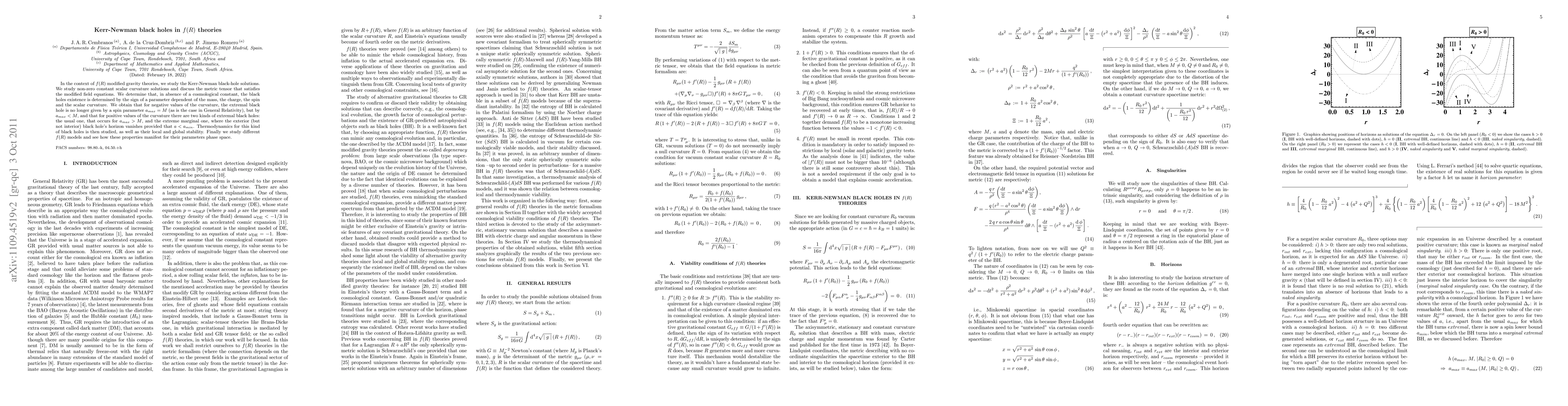 In the context of f(R) modified gravity theories, we study the Kerr-Newman black-hole solutions. We study non-zero constant scalar curvature solutions and discuss the metric tensor that satisfies the modified field equations. We determine that, in absence of a cosmological constant, the black holes existence is determined by the sign of a parameter dependent of the mass, the charge, the spin and the scalar curvature. We obtain that for negative values of the curvature, the extremal black hole is no longer given by a spin parameter a_max = M (as is the case in General Relativity), but by a_max < M, and that for positive values of the curvature there are two kinds of extremal black holes: the usual one, that occurs for a_max > M, and the extreme marginal one, where the exterior (but not interior) black hole's horizon vanishes provided that a < a_min. Thermodynamics for this kind of black holes is then studied, as well as their local and global stability. Finally we study different f(R) models and see how these properties manifest for their parameters phase space.