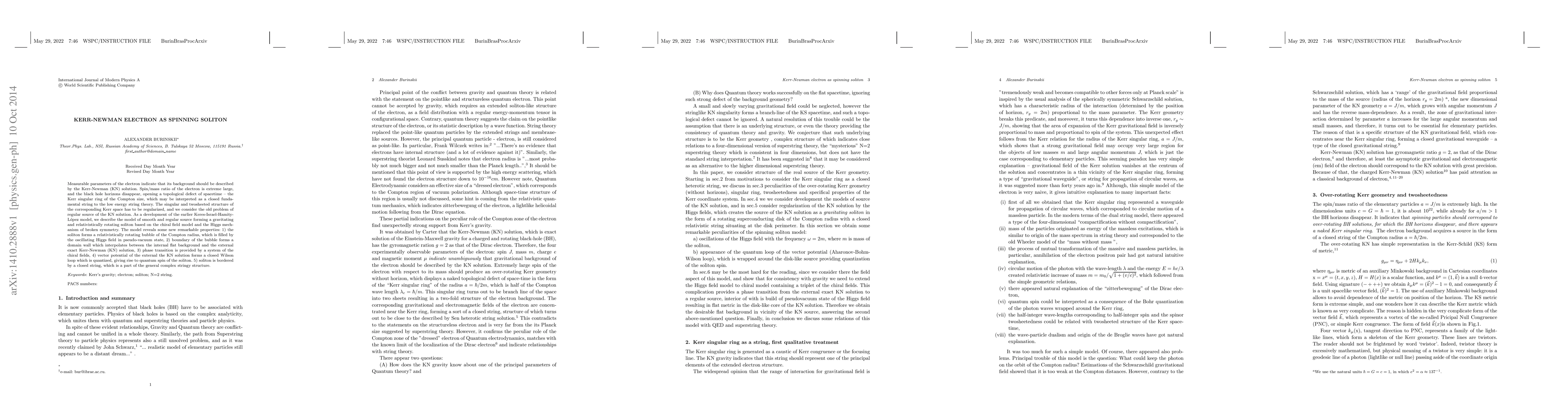 Measurable parameters of the electron indicate that its background should be described by the Kerr-Newman (KN) solution. Spin/mass ratio of the electron is extreme large, and the black hole horizons disappear, opening a topological defect of spacetime -- the Kerr singular ring of the Compton size, which may be interpreted as a closed fundamental string to the low energy string theory. The singular and twosheeted structure of the corresponding Kerr space has to be regularized, and we consider the old problem of regular source of the KN solution. As a development of the earlier Keres-Israel-Hamity-L\'opez model, we describe the model of smooth and regular source forming a gravitating and relativistically rotating soliton based on the chiral field model and the Higgs mechanism of broken symmetry. The model reveals some new remarkable properties: 1) the soliton forms a relativistically rotating bubble of the Compton radius, which is filled by the oscillating Higgs field in pseudo-vacuum state, 2) boundary of the bubble forms a domain wall which interpolates between the internal flat background and the external exact Kerr-Newman (KN) solution, 3) phase transition is provided by a system of the chiral fields, 4) vector potential of the external the KN solution forms a closed Wilson loop which is quantized, giving rise to quantum spin of the soliton. 5) soliton is bordered by a closed string, which is a part of the general complex stringy structure.