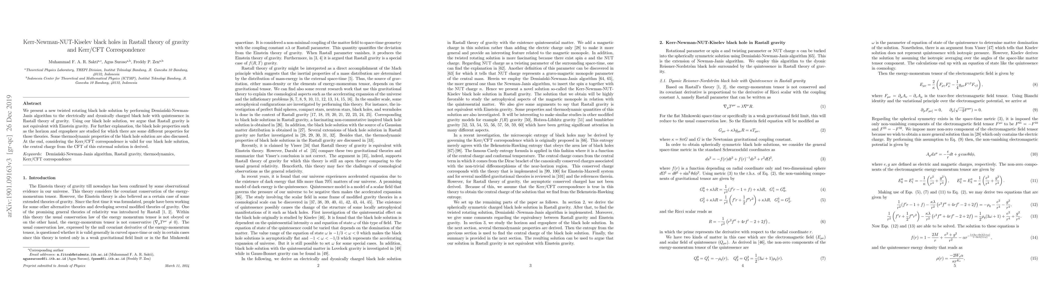 This paper introduces a new rotating black hole solution in Rastall theory of gravity using the Demiański-Newman-Janis algorithm, demonstrating that Rastall gravity differs from Einstein gravity. It explores the black hole's thermodynamic and geometric properties, and derives the central charge for the Kerr/CFT correspondence.